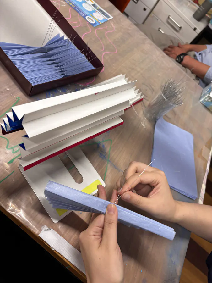 お花紙をきれいに蛇腹に加工して、針金で固定して作り溜めます。お花開きまでもうすぐです。