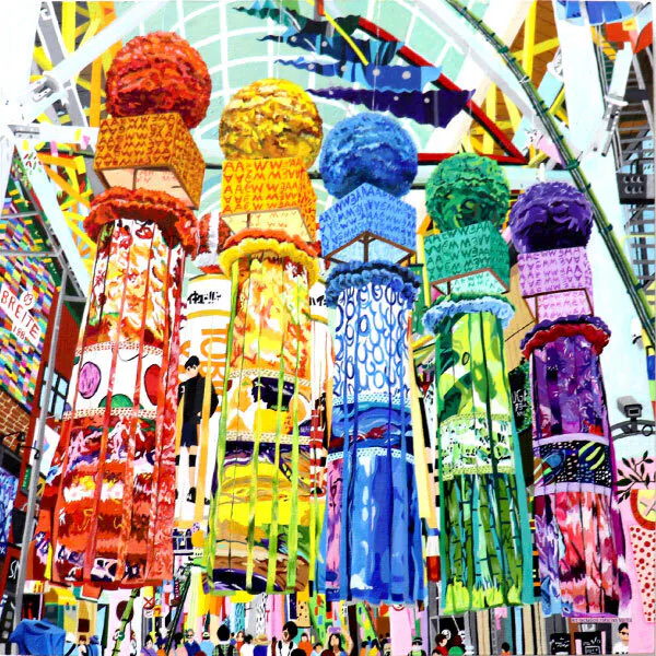 そこで、塩竈の港まつり、仙台七夕と続いたので、あと3枚宮城のお祭りの風景画を描いて七夕飾りの薬玉と吹き流しの間に配置される行燈パーツに飾り、私たちの暮らす宮城の風景や季節を、七夕飾りを通じてもっと多くの人に届けたい。と考え、真梨菜さんにさらに3枚の作品の描き下ろしを依頼しました。