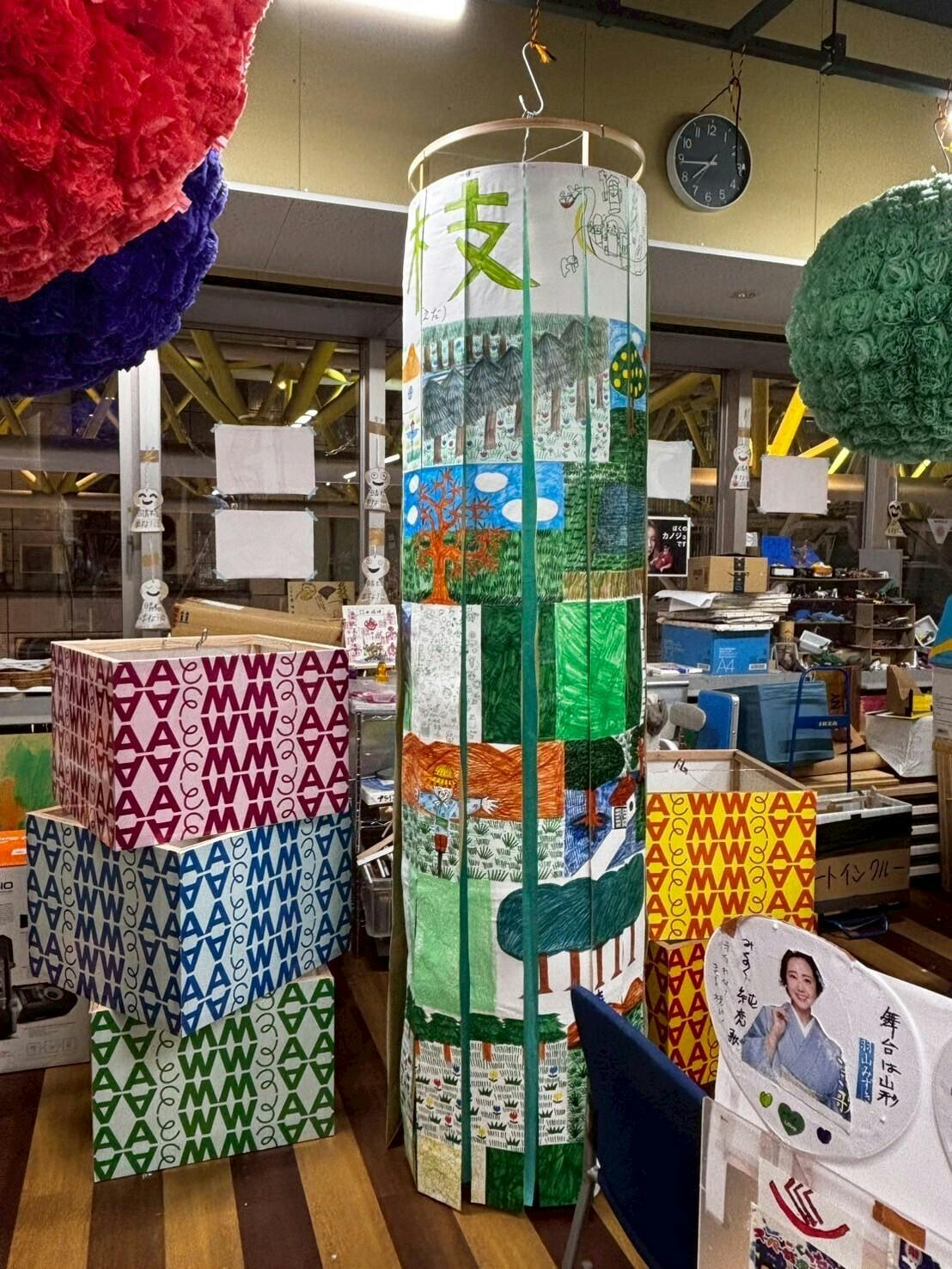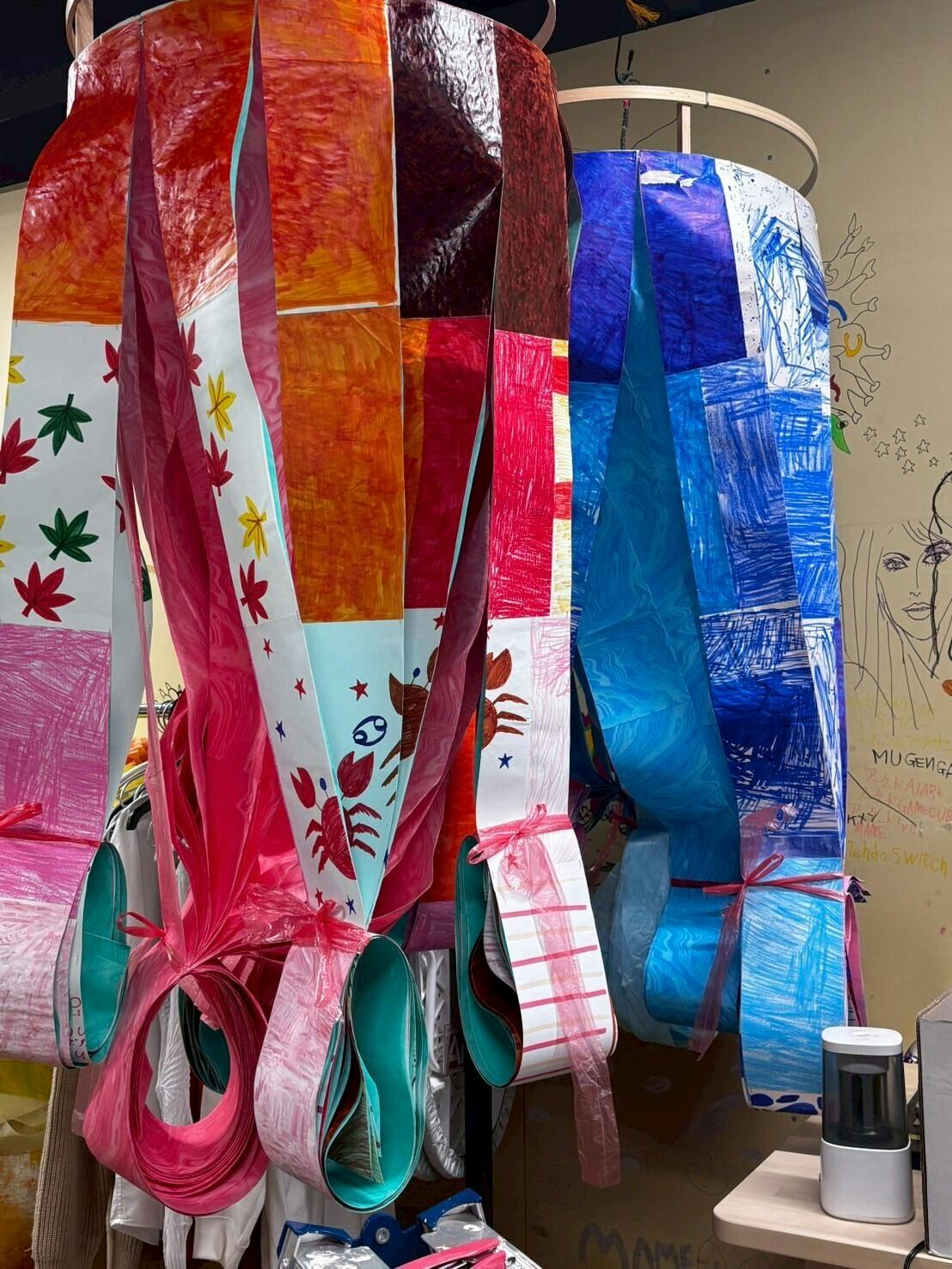 青い吹き流しは青が大好きなかっつんが担当。コロナで在宅で描いていたときの作品も沢山入っています。真っ青、暑い今年の夏なのでブルーで涼を感じていただけたら嬉しいです。