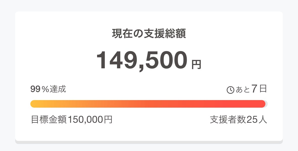 皆様の温かいご支援や応援のおかげで99%達成!というか、あと500円です!!!