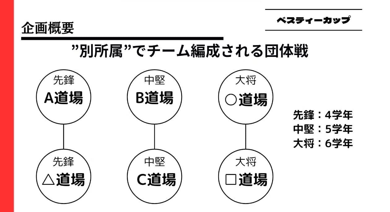 今回の柔道大会は、試合自体のルールはベースのものとしつつ、少し既存のルールとは違った要素を取り入れています。3人制の団体戦の形式ですが、”編成されるチームは別所属”になります!