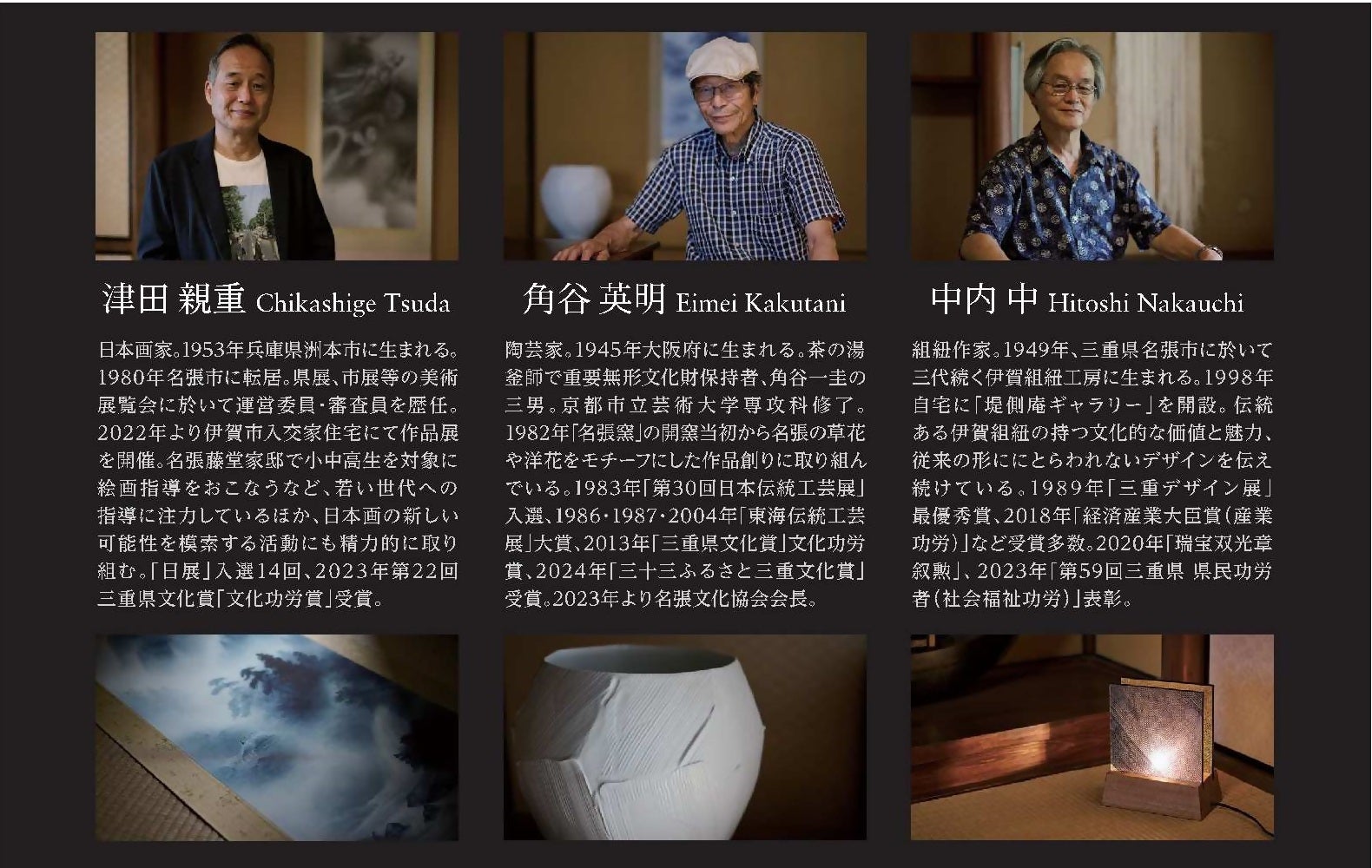 名張の美実行委員会は、三重県名張市内の史跡等を活用し、市内で活動する美術工芸作家作品を展示し、市内の文化芸術振興に寄与することを目的に、名張市内でプロ作家として活動している、津田親重(日本画)、角谷英明(陶芸)、中内中(組紐作家)の3名が発起人となり、2024年に設立いたしました。