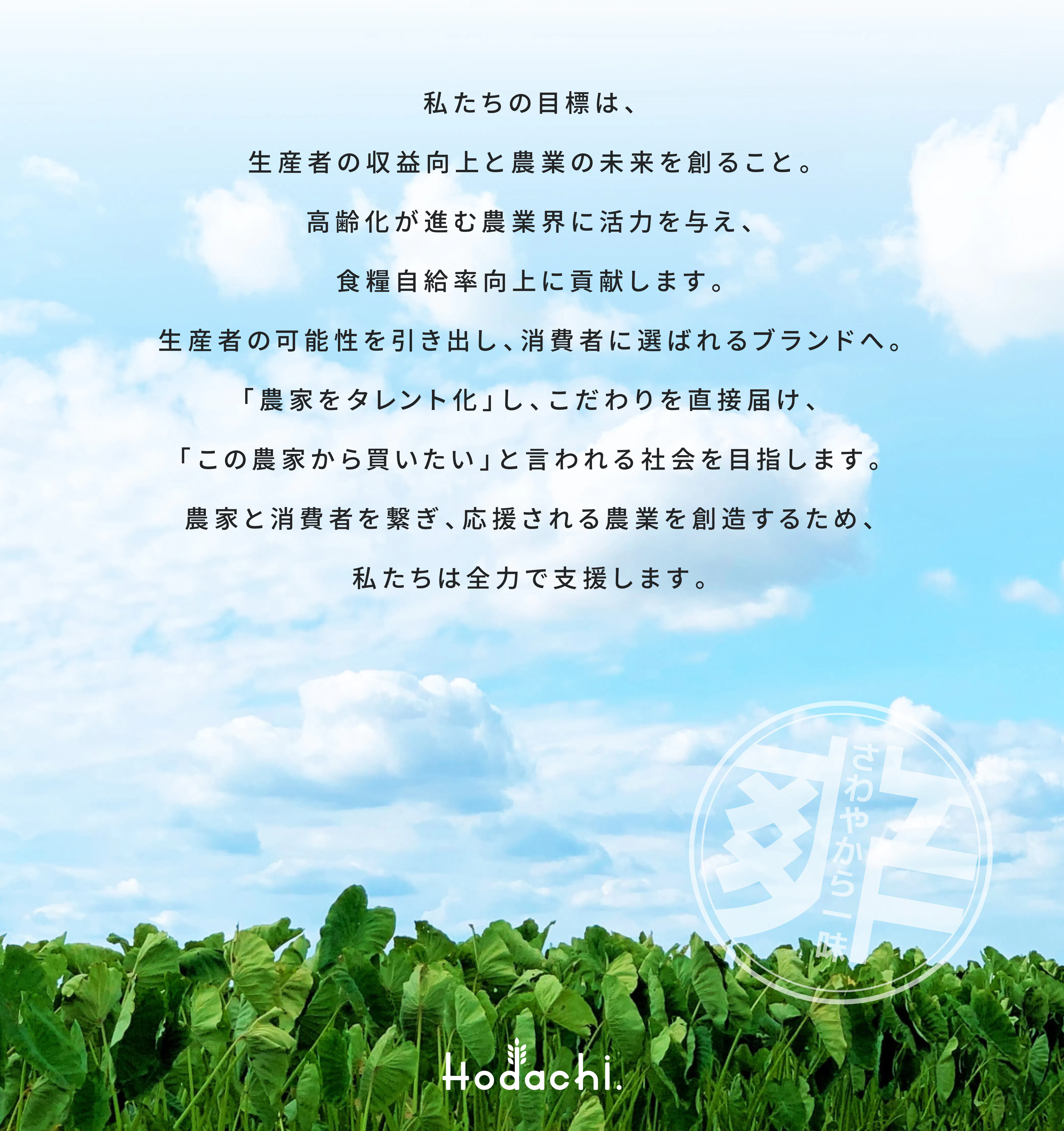そこで、一次生産者さん達に寄り添い、何か出来る事をサポートし、もっと世間の人たちに農業に対する興味関心を持って頂けるように「Hodachi.」が発足されました。