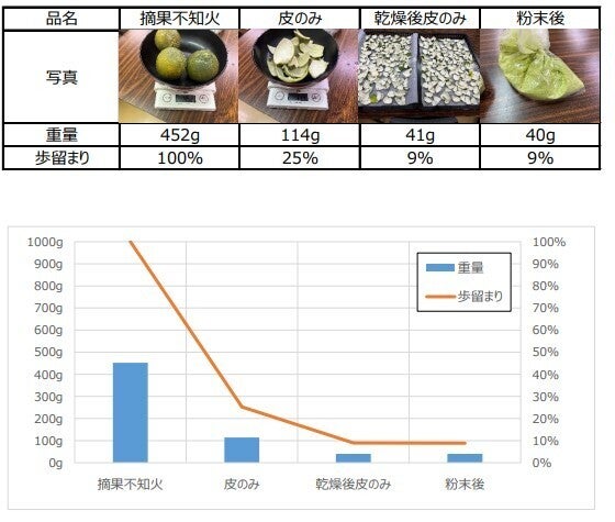 乾燥前の皮1.13㎏、乾燥後の皮0.40kgになる為、35.3%の濃縮率となります。