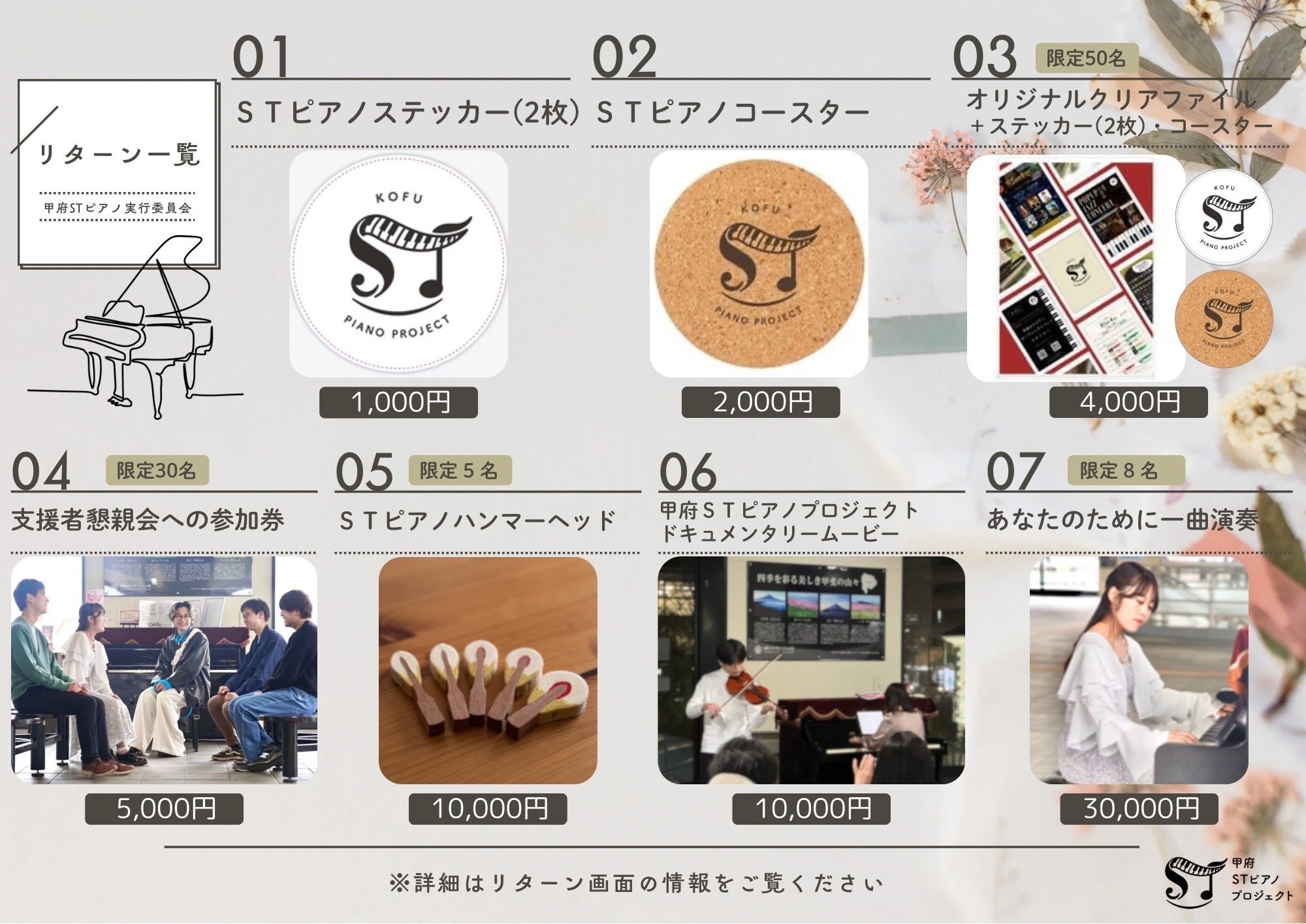 さらには、過去のイベントやピアノ設置の経緯などをまとめた限定映像や、あなたのために一曲弾きます券などさまざまなリターンを用意しています!