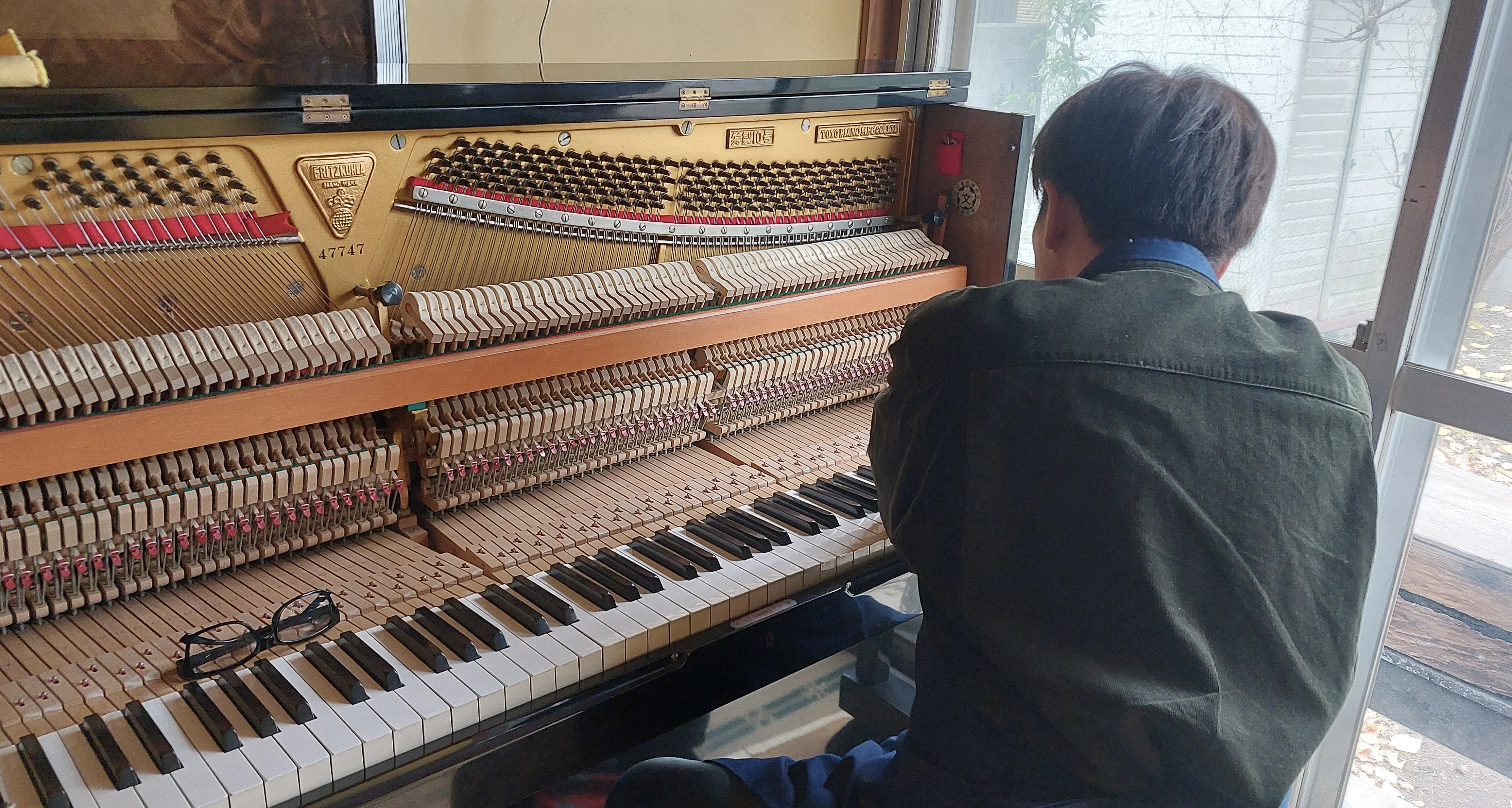 現状、半屋外に設置していることでピアノ自体の劣化も音の狂いも格段に早い速度で進んでしまうのですが、弾く人が気持ちよく弾けるようにと考え、いつも調整調律や修理をしてくださいます。
