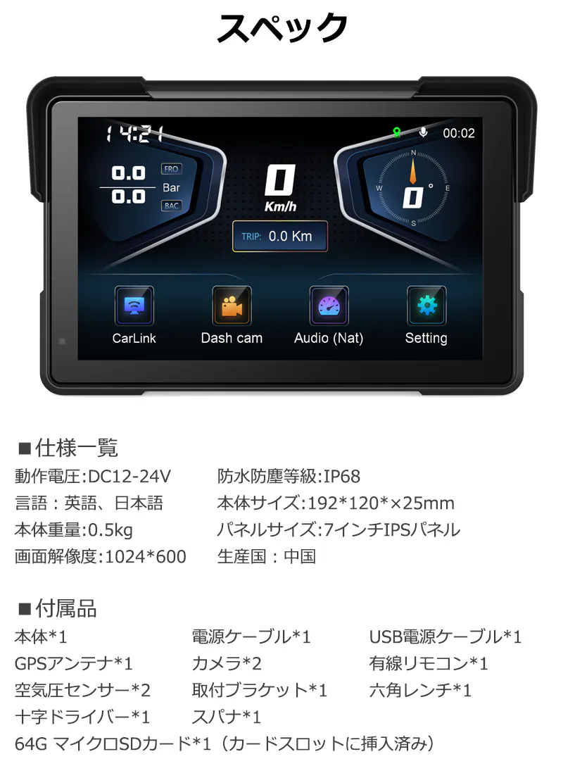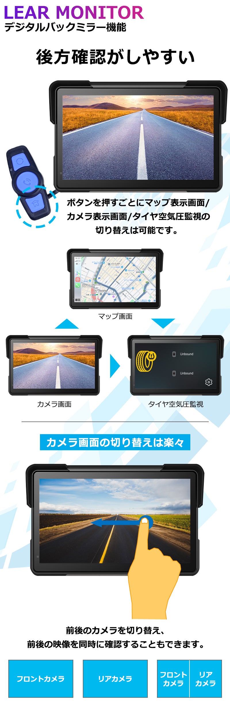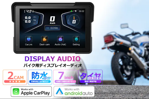 有線リモコンが付属しており、充電不要で電波の影響を受ける心配もありません。ハンドルから手を離さずに、ウインカーを操作する感覚で画面の切り替えが可能。さらに、ハンドル操作だけで電話の応答や通話の終了もできるため、より安全で快適なライディングをサポートします。
