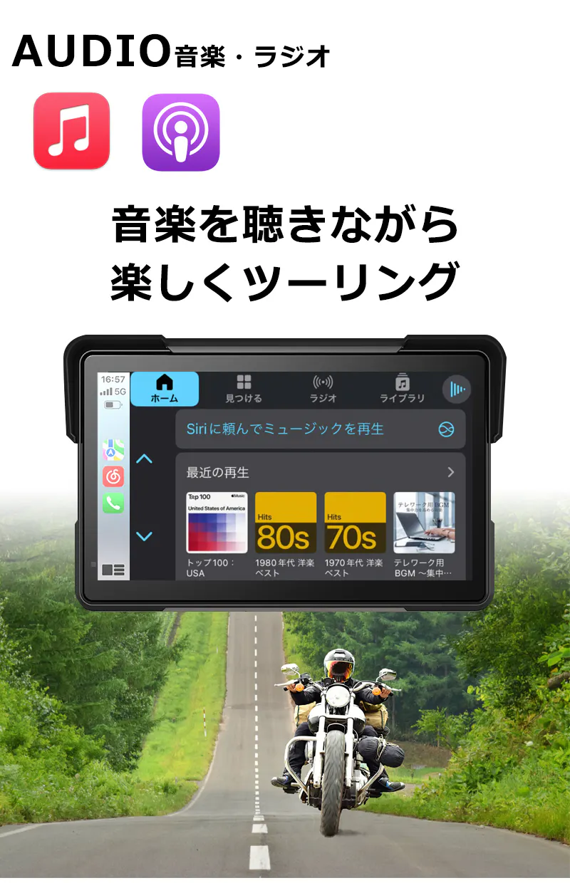 CarPlayやAndroid Autoに対応しているので、Apple Music、Spotify、Amazon Musicなどの音楽サブスクアプリが利用可能。スマホに音楽を保存する必要がなく、いつでも手軽にお気に入りの音楽を楽しめます。