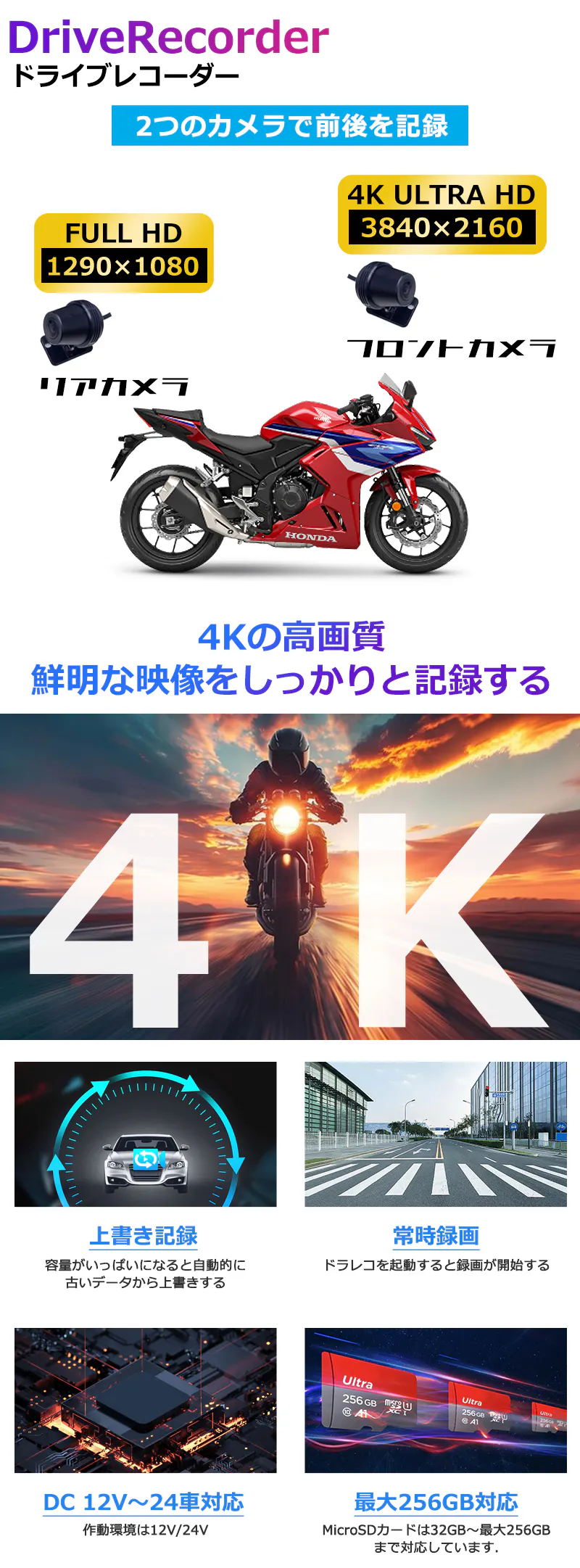 フロントカメラとリアカメラでバイクの前後をしっかり録画し、走行中の状況を正確に記録。事故やトラブル発生時にも映像を残せるため、万が一の際の証拠として活用できます。さらに、ツーリング中の美しい景色や思い出のルートを記録することも可能。安全性と楽しさを両立し、より快適なバイクライフをサポートします。