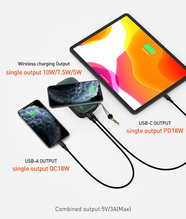 ワイヤレスチャージの他にUSB-CおよびUSB-Aポートが搭載されている為、組合せによりあらゆるデバイスを同時に3台充電する事が出来ます。スマートフォン、AirPods、タブレット、スマートウォッチ、ゲーム、充電の組合せはその日の持ち物で選べます。
