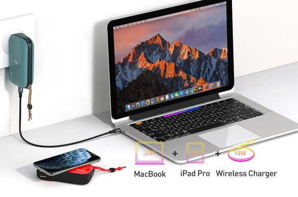 Mr ChrgerをACコンセントに接続している際はPD30Wに対応。MacBook, MacBook Air, MacBook Pro, Surface Book他のノートPCをチャージ可能です。