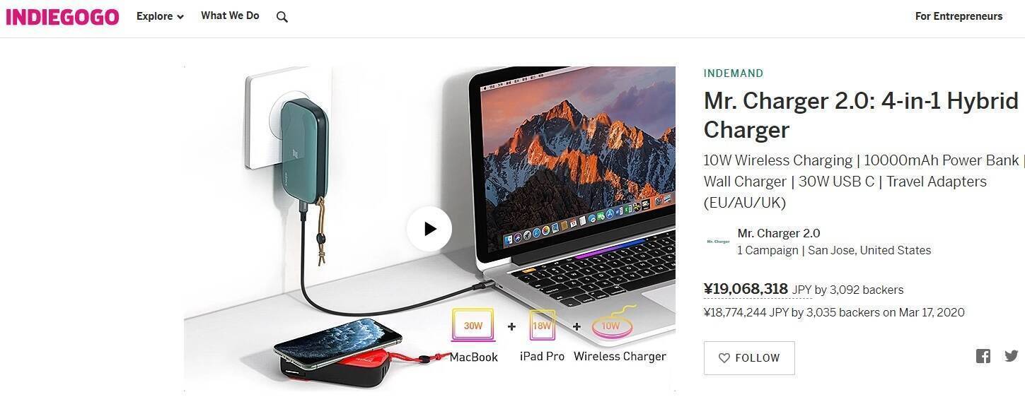 2019年11月に前バージョンのMr Chargerプロジェクトを実施させて頂きました。スマートフォンへ接続するケーブルを内蔵しているタイプで好評を賜り86人の方からご支援を頂きました。ご支援頂いた皆様、ありがとうございました。ただ同時にワイヤレスチャージへの対応要望が少なくない方からあったのも事実です。メーカーIDMIX社の方にフィードバックを行い、今回ワイヤレスチャージ対応、またPD対応と前バージョンより更に進化したMr Charger Ver2.0を紹介させて頂く運びとなりました。ぜひよろしくお願い申し上げます。 なお今回のCH06、日本でのプロジェクト実施に先立ち、アメリカ INDIEGOGOで以下の様に3月17日までプロジェクト実施され、3000人を超える方からご支援を頂いています。参考にご紹介させて頂きます。日商Pro映像株式会社 代表 岩崎