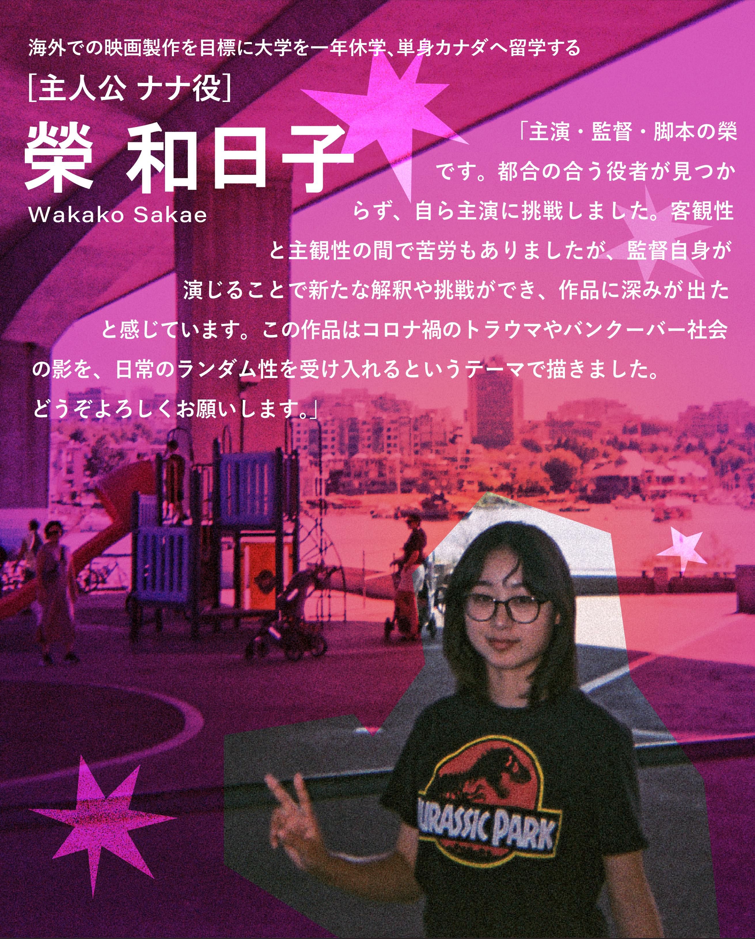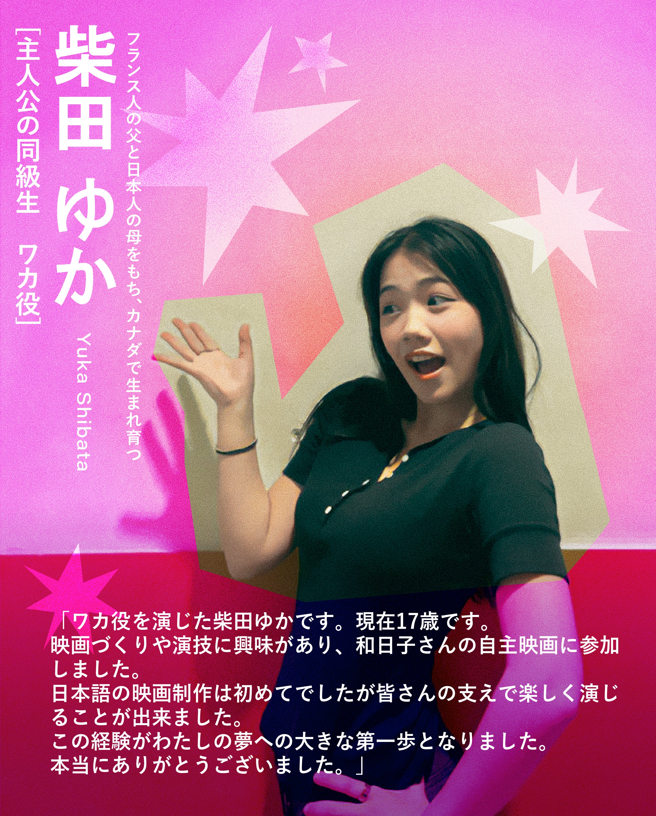 こんにちは!クラファン運営のYです!本日はキャスト紹介第二弾です!主人公ナナの同級生ワカ役を演じる柴田ゆかさんのご紹介です。ワカは明るく天真爛漫なキャラクターなのですが、ゆかさんご本人もまさにそんな雰囲気でゆかさんにぴったりなキャラクターです!コメント「ワカ役を演じた柴田ゆかです。現在17歳です。映画作りや演技に興味があり、和日子さんの自主映画に参加しました。カナダ育ちで日本語の映画制作は初めてでしたが、皆さんの支えで楽しく演じることが出来ました。この経験が夢への大きな第一歩となりました。本当にありがとうございました!」ここまでお読みいただきありがとうございました!明日は第三弾、ナナの仕事仲間ハル役のキャストをご紹介いたします!