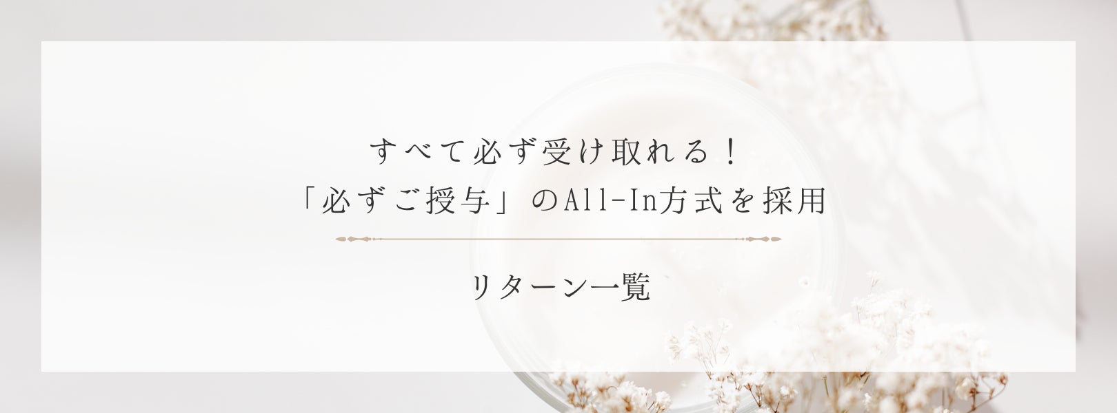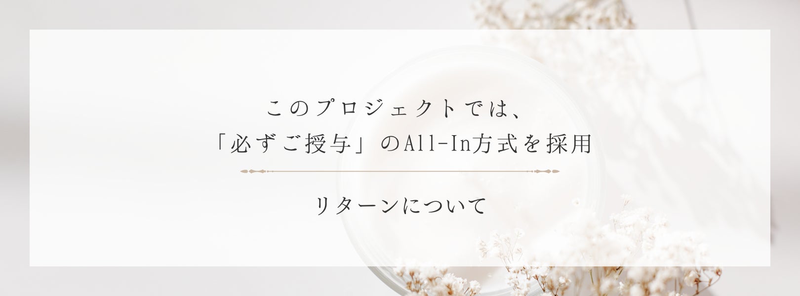 このプロジェクトでは、「必ずご授与」のAll-In方式を採用し、支援者の皆様へ特別なリターンをご用意しました。