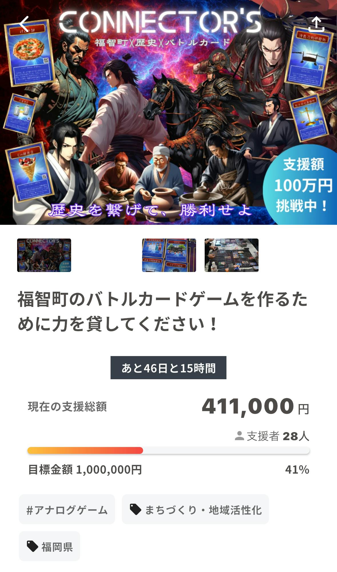 支援者は28名、支援総額は411,000円(達成率41.1%)。
