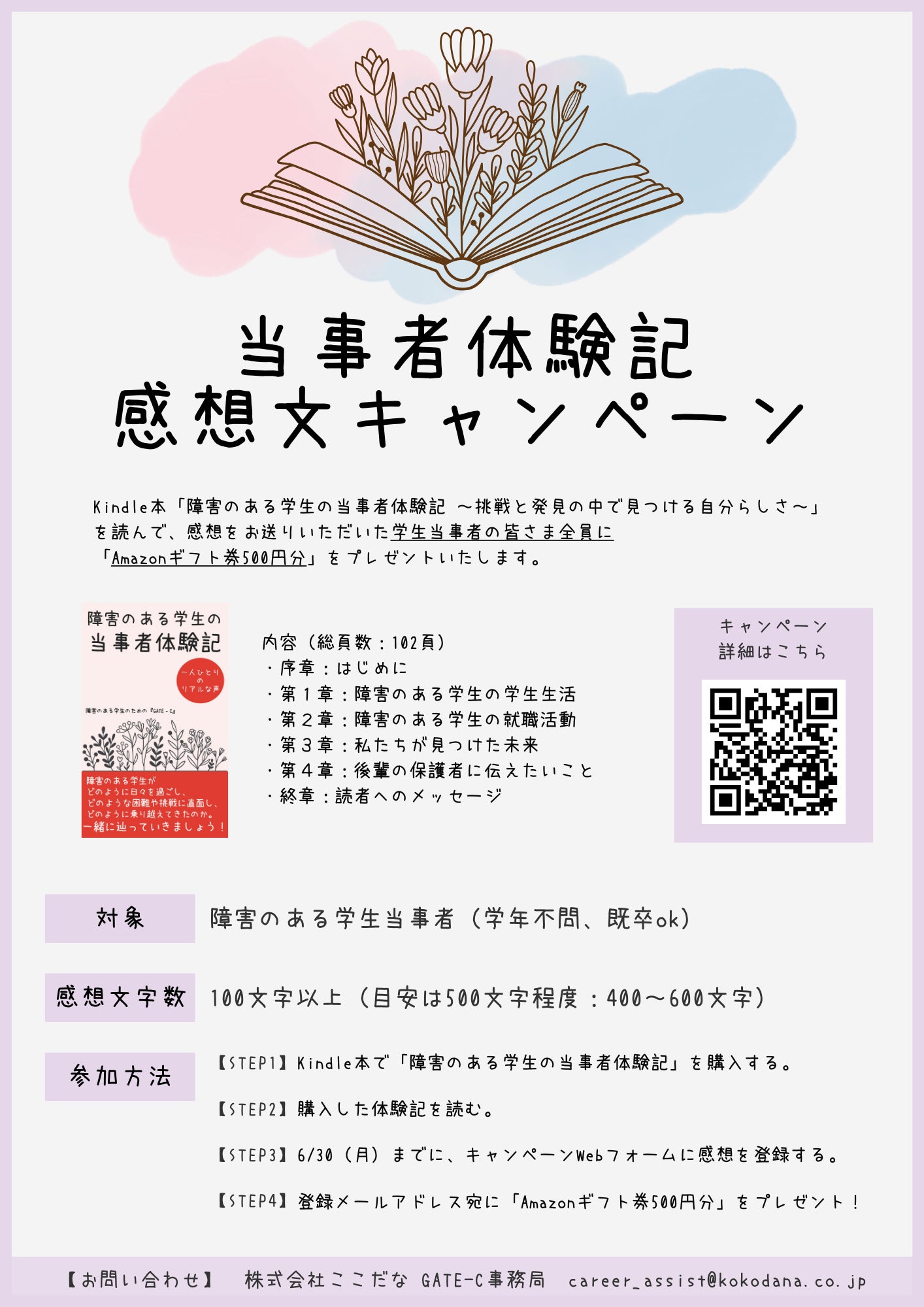 定価500円で販売しておりますが、学生当事者の方々にはご負担なくお読みいただきたいと思いまして、Kindle本を購入後、感想をお送りいただいた学生当事者全員に「Amazonギフト券500円分」をプレゼントする「当事者体験記」感想文キャンペーンを、このプロジェクトを通じて実現したいと考えています。
