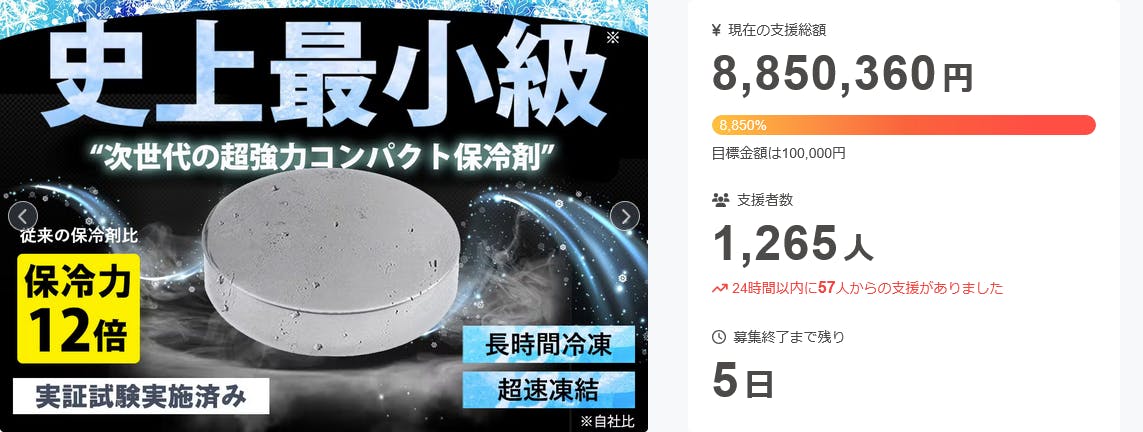 超コンパクト保冷剤【モンスター保冷】プロジェクト、なんと達成率は 8,850%に達し