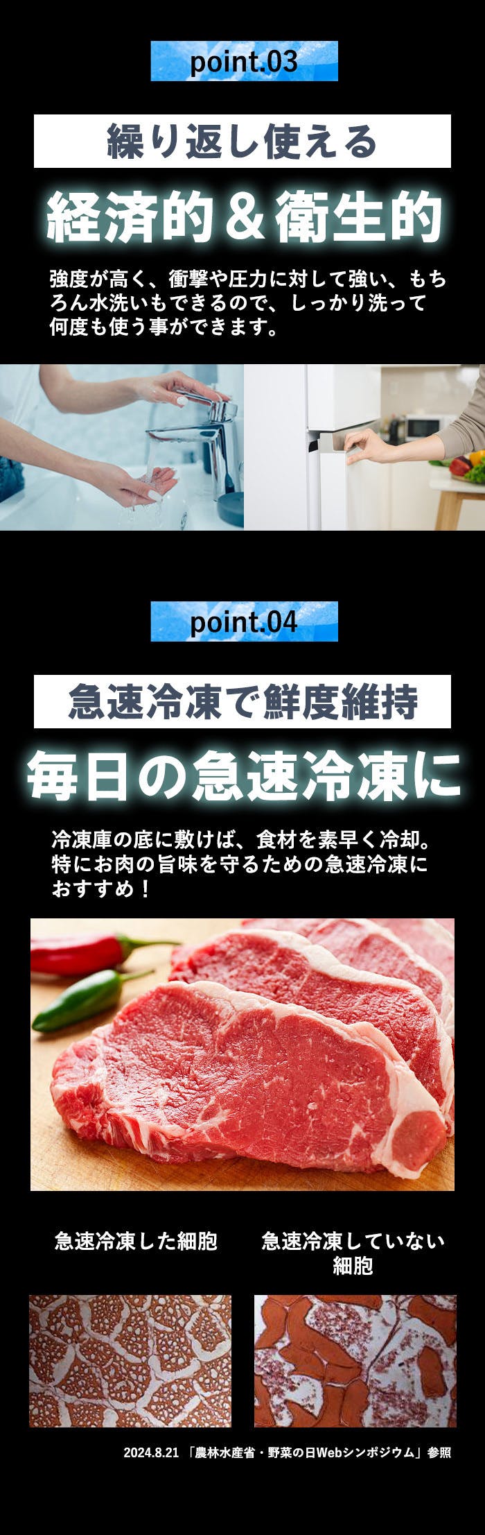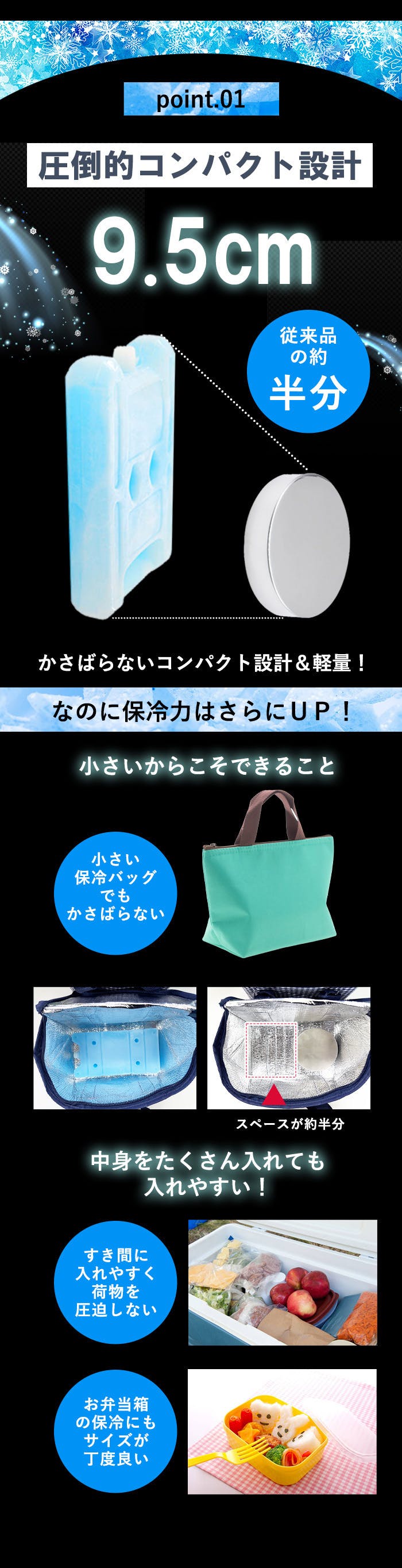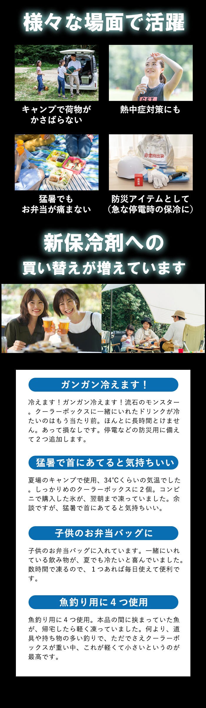 ・クーラーボックスや保冷バッグに入れてお使いください。保冷時間は、使用環境、外気、クーラーボックスの種類、冷やす食材の量、等によって異なります。