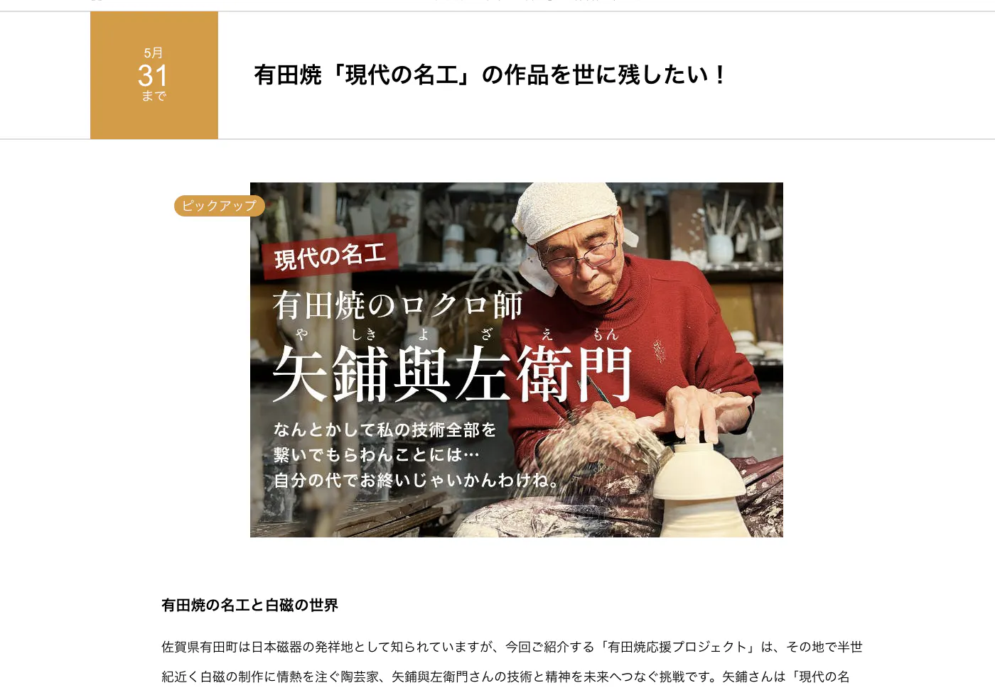 伝統的な有田焼の技法を次世代に繋ぐため、手作りの有田焼の魅力を発信するためのクラウドファンディングです。