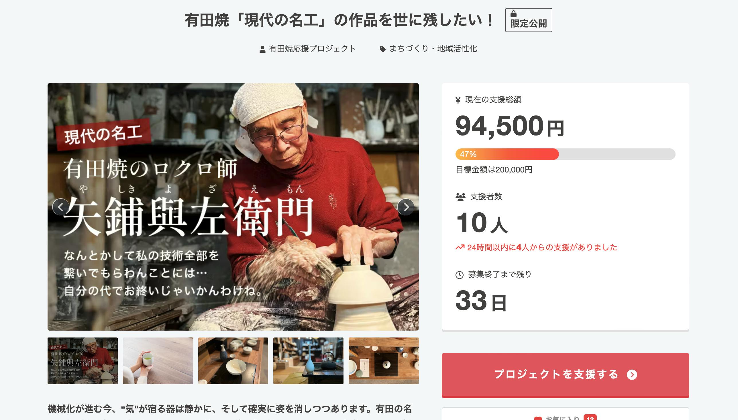 スタートから48時間で目標額の40%に到達することができました!!たくさんの方からご支援をいただき、励ましのメッセージも多数いただいております。ご支援いただきほんとうにありがとうございます。この間、ご縁の尊さとありがたみをヒシヒシと感じています。それとともに、ご支援に報いる責任も大きいものがあるなと、身が引き締まる思いです…がんばります!!明日からは有田陶器市が佐賀県有田町内ではじまります。期間中に毎年100万人以上もの人が集まる年に一度のビッグイベント。一年のほとんどの売り上げをこの期間でたたき出すところもある、といわれるほどです。矢鋪與左衛門窯は町内に仮設の展示場を構え、展示販売とロクロ・絵付の体験を行う予定です。陶器市の様子はこちらの活動報告や、窯の公式インスタグラムでも発信しています。そちらもぜひご覧になってください!