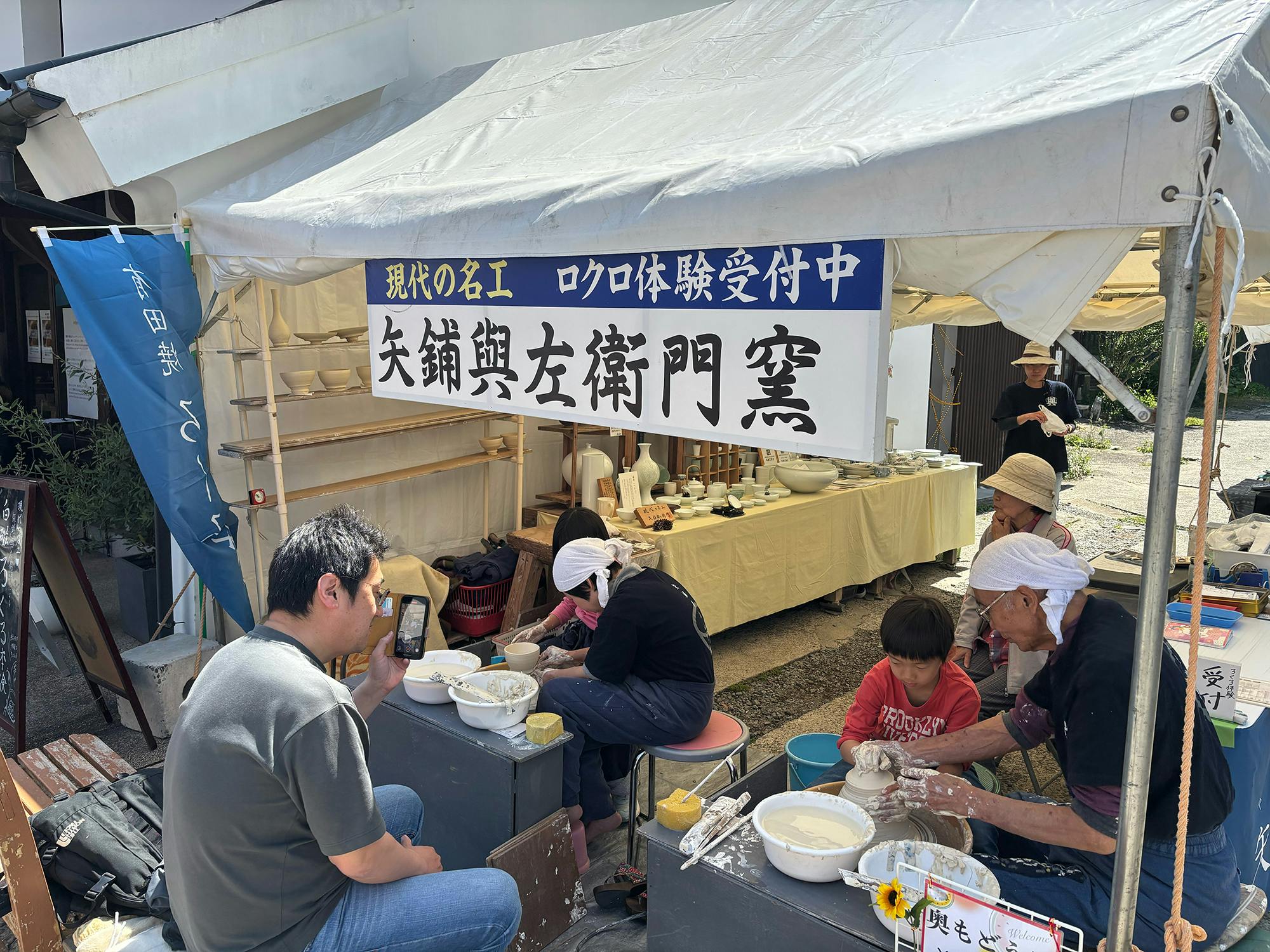 今年の有田陶器市が始まりました。矢鋪與左衛門窯も町の中央あたりに出店し、朝からロクロ体験のお客様などでにぎわっています。ロクロ体験はやっぱり目立ちます!店の前はいつも見学の方で人だかり。先生も気合いが入るのか、いつもよりトークがキレキレです!場所は有田町のカフェ、kasaneさんの横になります。人出と渋滞はすごいみたいですが…お近くの方はぜひお越しください!!