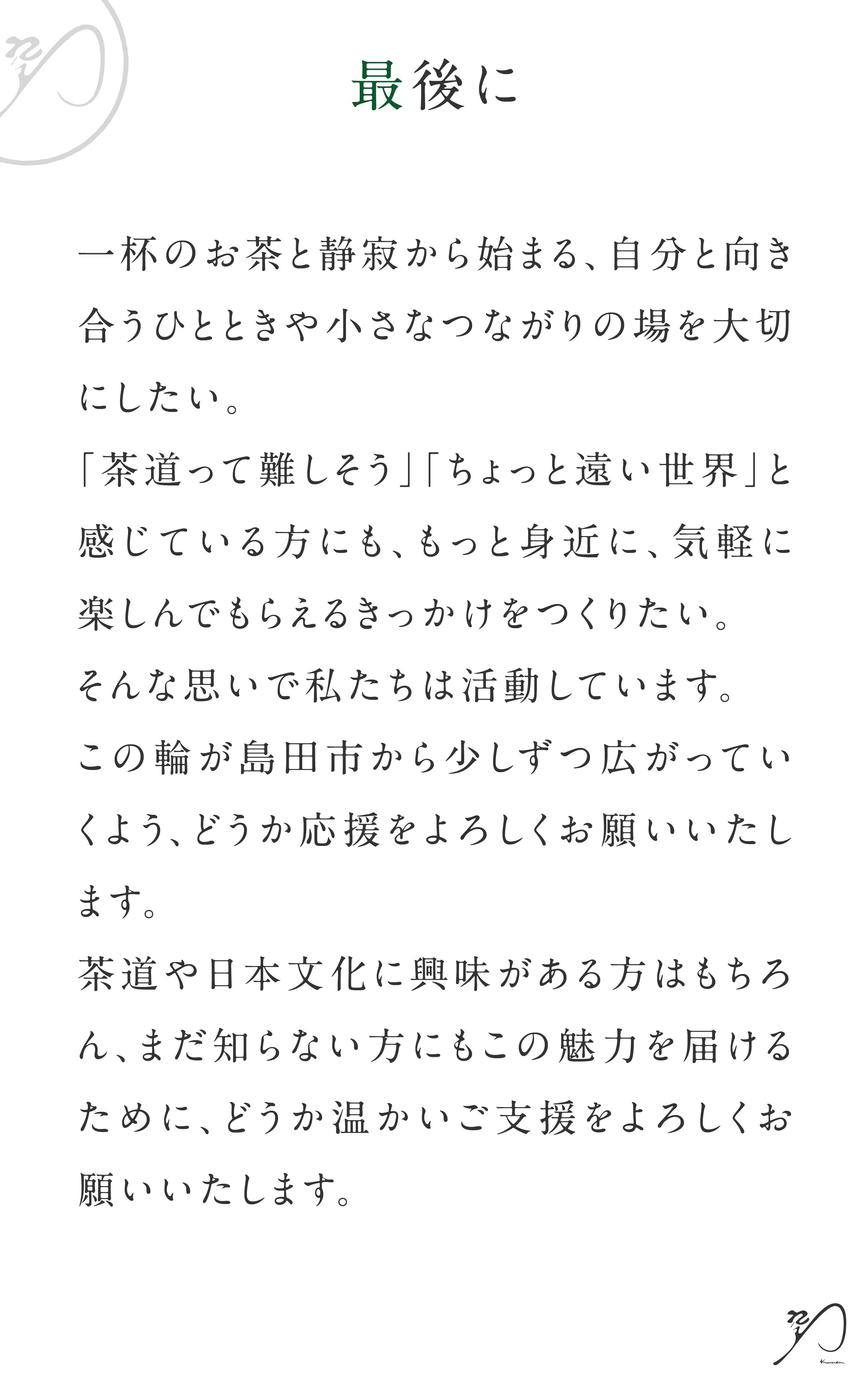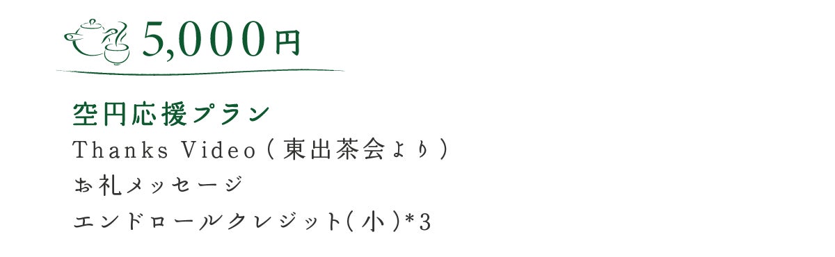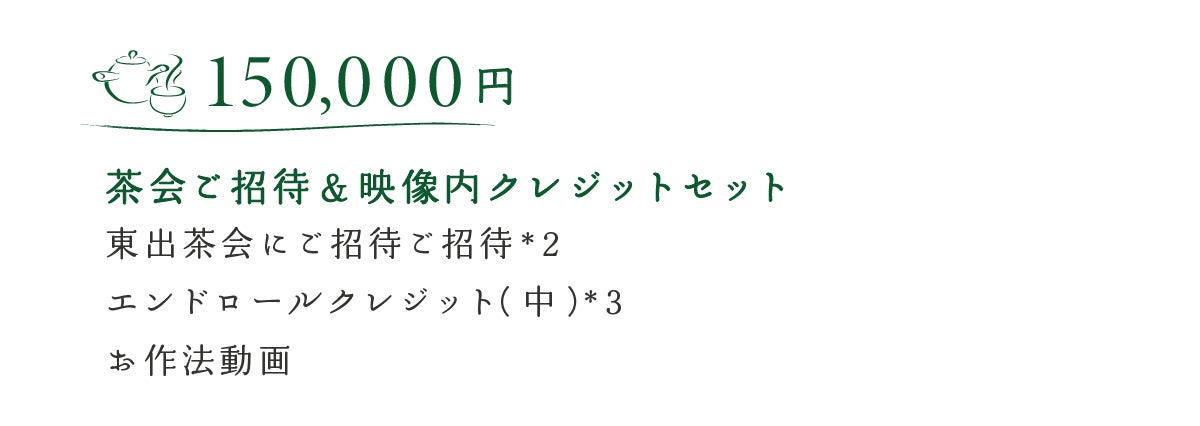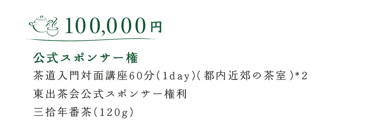※2:2025年9月1日(月)〜2026年7月31日(金)までの間に都内近郊にて毎月開催される茶会のいずれか一回に参加いただけます。具体的な日程については、支援者さまとメールでご相談の上決定させていただきます。