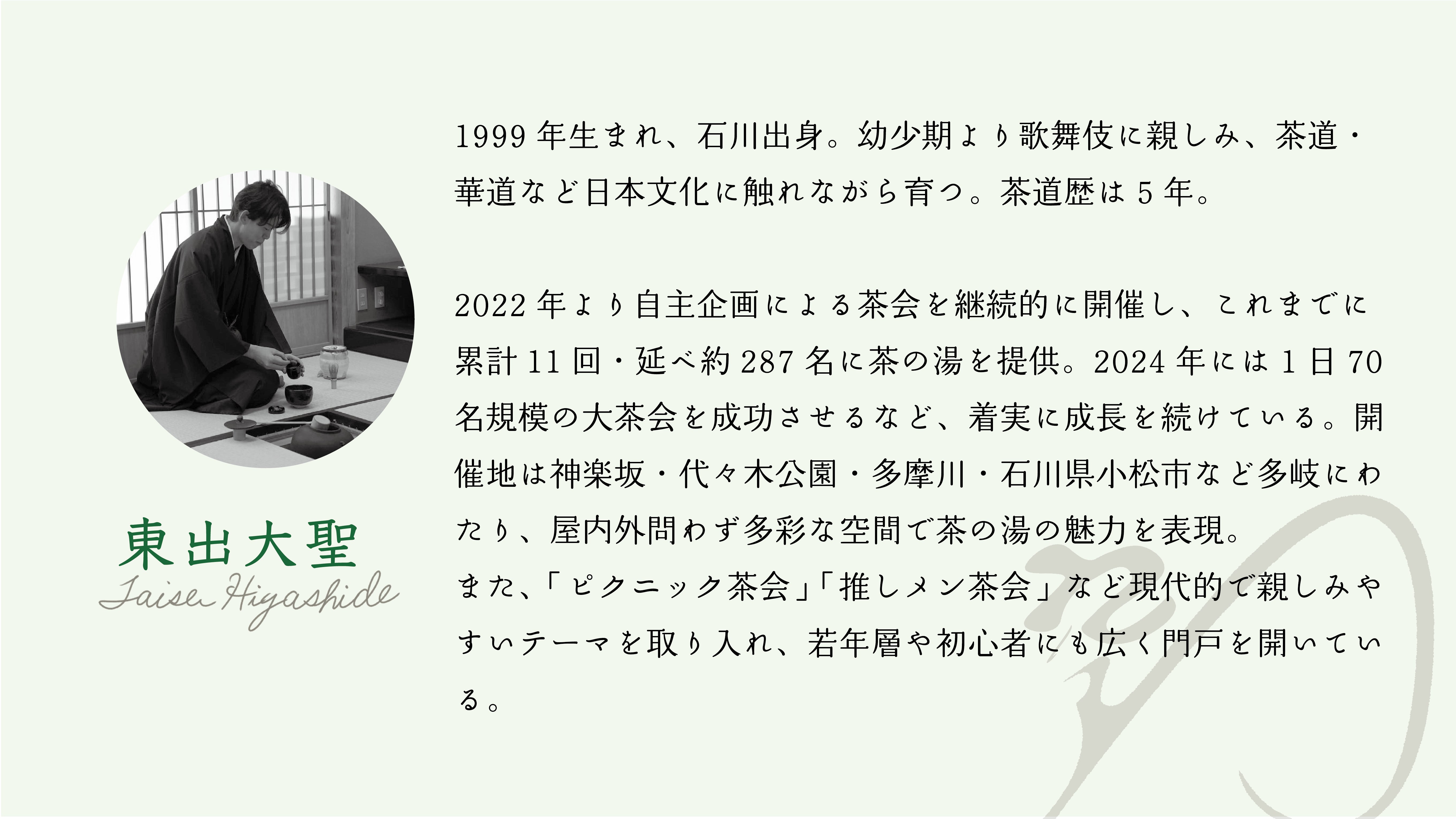 だからこそ私たちは、「日常のお茶」から出発し、誰もが気軽に触れられる茶文化を再提示することで、茶道が本来持つ豊かさをもう一度現代にひらいていきたい――そうした思いから本プロジェクトは立ち上がりました。
