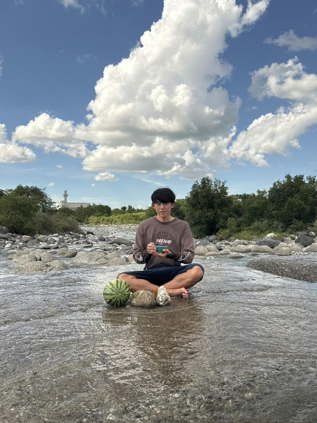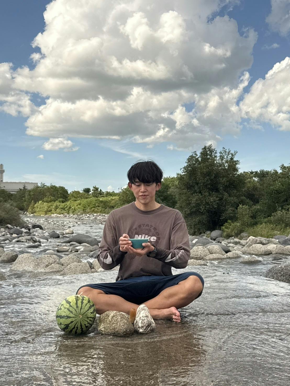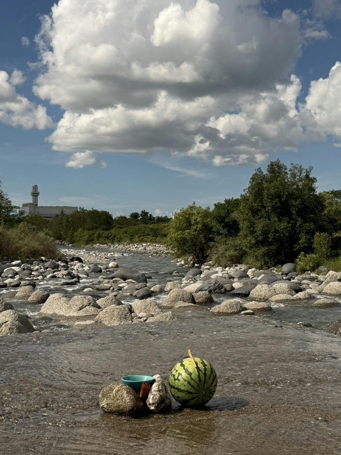 私は近所の八百屋で手に入れた大きなスイカと抹茶道具を抱えて、いざ川遊びへ。
