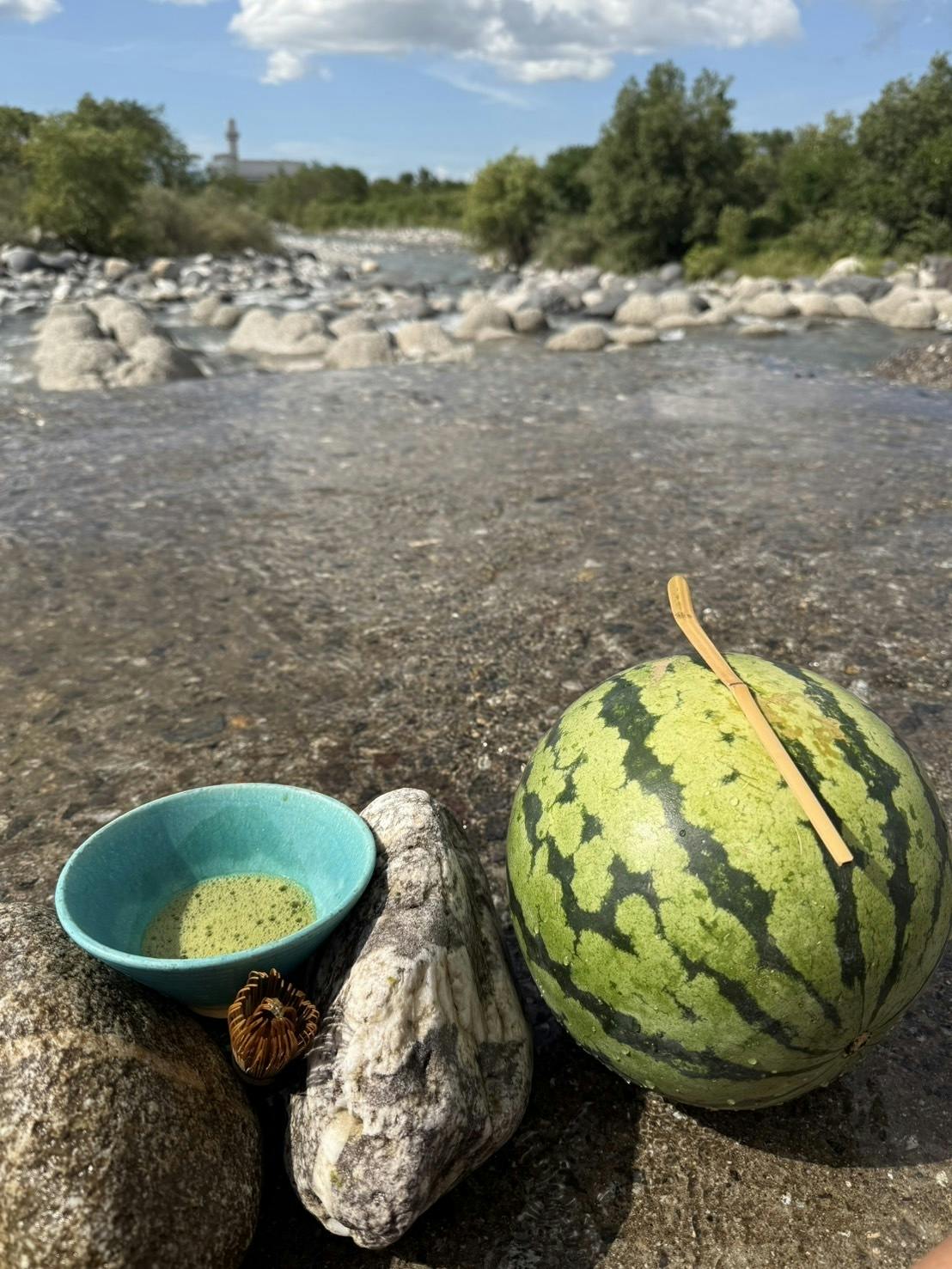 川のせせらぎを聞きながら点てる一服は、まさに夏の贅沢。冷茶はひときわ涼やかに感じられ、甘いスイカも欠かせないお供になりました。