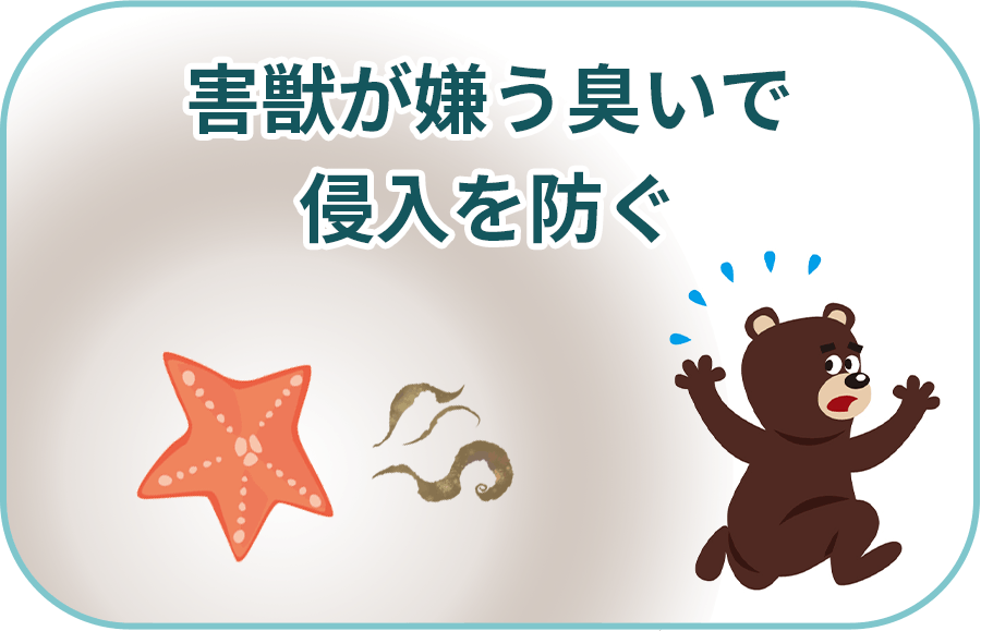 A. ヒトデには「サポニン」という動物が嫌がる強力な防衛成分が含まれており、昔から漁師の間でその効果が知られていました。これにホタテのうろを配合することで、水を含むと粘土状になり土壌に浸透して長期間効果が持続するという特性が生まれました。この二つの海の恵みを組み合わせることで、効果的かつ持続性のある忌避剤が完成しました。