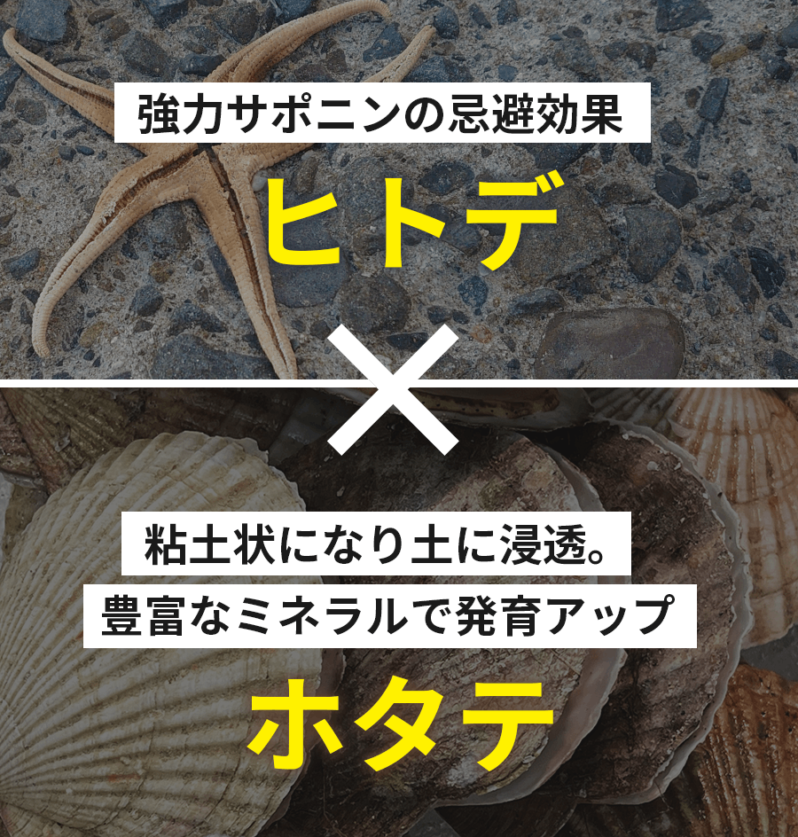 ヒトデとホタテのミネラル豊富な原料は土壌の質を向上させ、作物の生育を促進します。農害対策を行いながら、作物の成長促進も期待できる一石二鳥の忌避剤です。農作物の収穫量アップにも貢献!