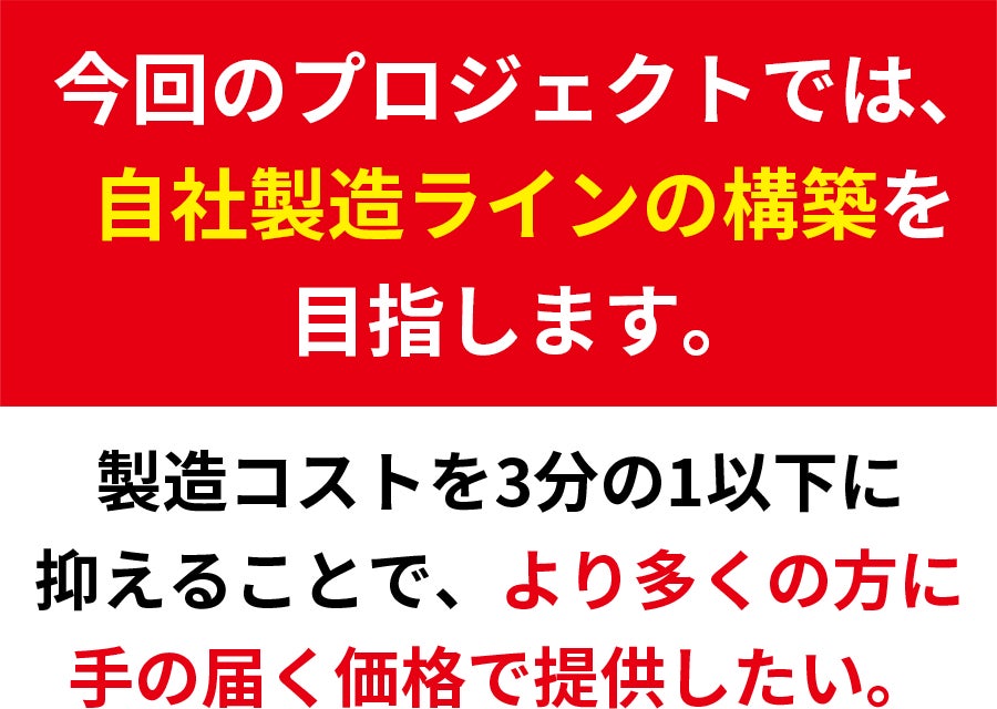 A. 現在の製造コストが高く(1kgあたり約3000円)、本当に必要としている方々に手頃な価格で提供できていません。クラウドファンディングで資金を調達し、自社製造ラインを構築することで、製造コストを3分の1程度に抑え、より多くの方に届けられる価格で提供したいと考えています。