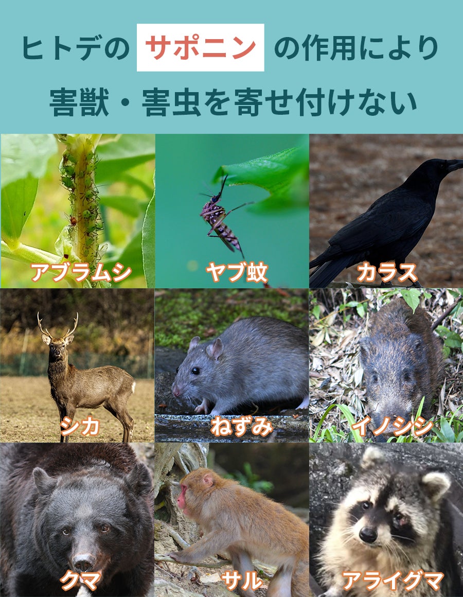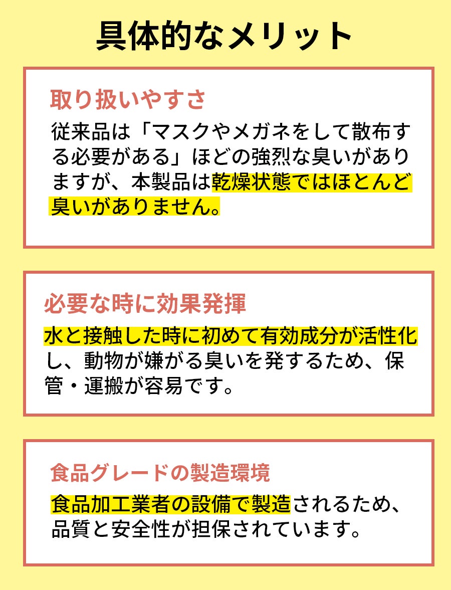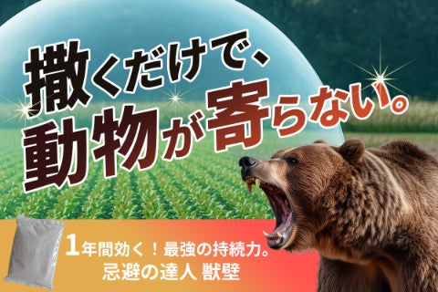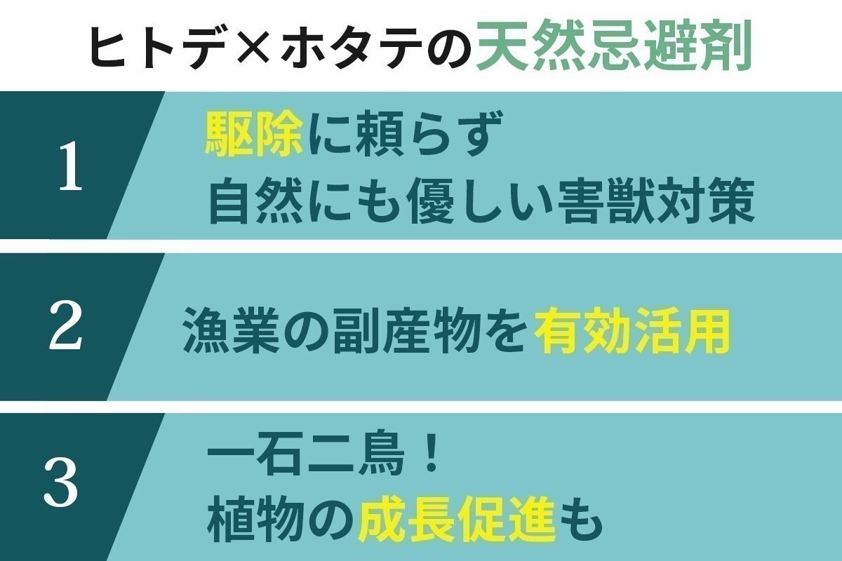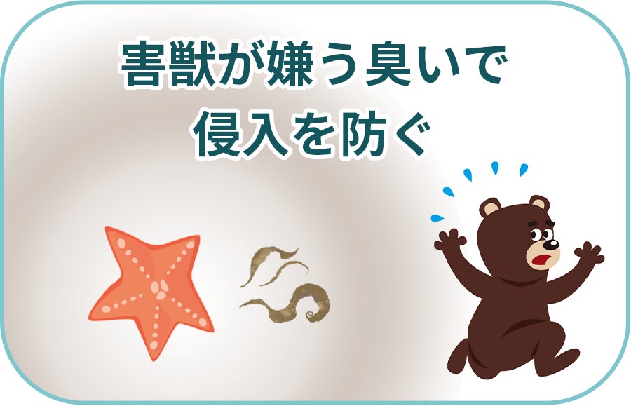 A. 北海道産のヒトデとホタテのうろを特殊配合した忌避剤で、野生動物や害獣を寄せ付けない効果があります。匂いによって動物を遠ざけるため、駆除せずに被害を防ぐことができます。さらに、原料に含まれるミネラルにより植物の生育を促進する効果も確認されています。
