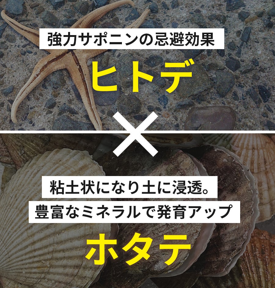 ヒトデとホタテのミネラル豊富な原料は土壌の質を向上させ、作物の生育を促進します。農害対策を行いながら、作物の成長促進も期待できる一石二鳥の忌避剤です。農作物の収穫量アップにも貢献!