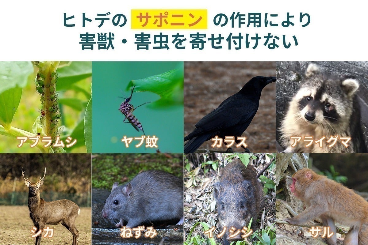 最近の研究から、アブラムシやヤブ蚊などの害虫から、シカ、ねずみ、イノシシ、クマ、サル、アライグマなどの動物、カラス、ハト、なめくじなどに対する忌避作用があることがわかりました。