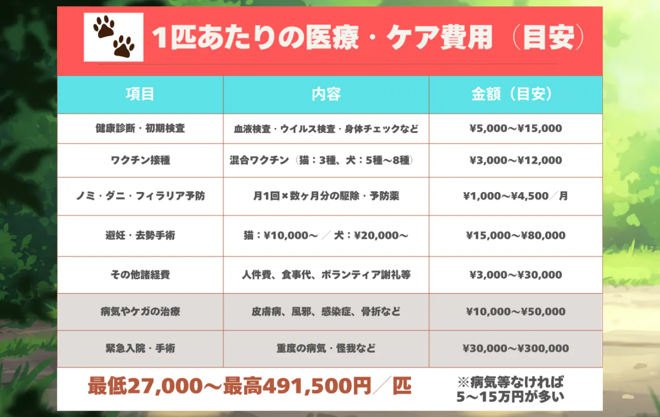 新しい家族の元へ行くまでに1匹あたり平均4~12万円が必要と言われています。