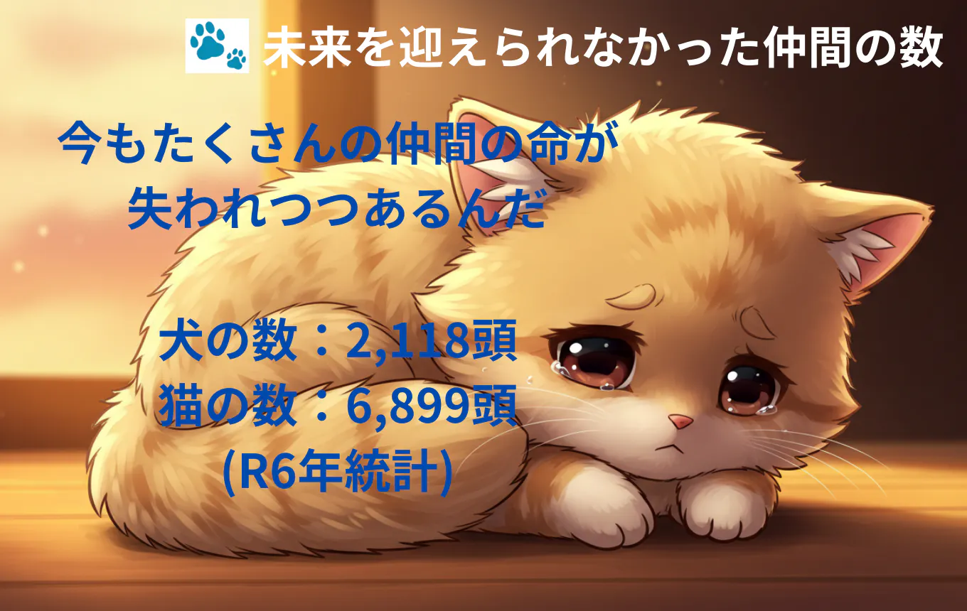 環境省の統計によると、年間約6万匹の犬と猫が全国の自治体に保護されていると言われています。
