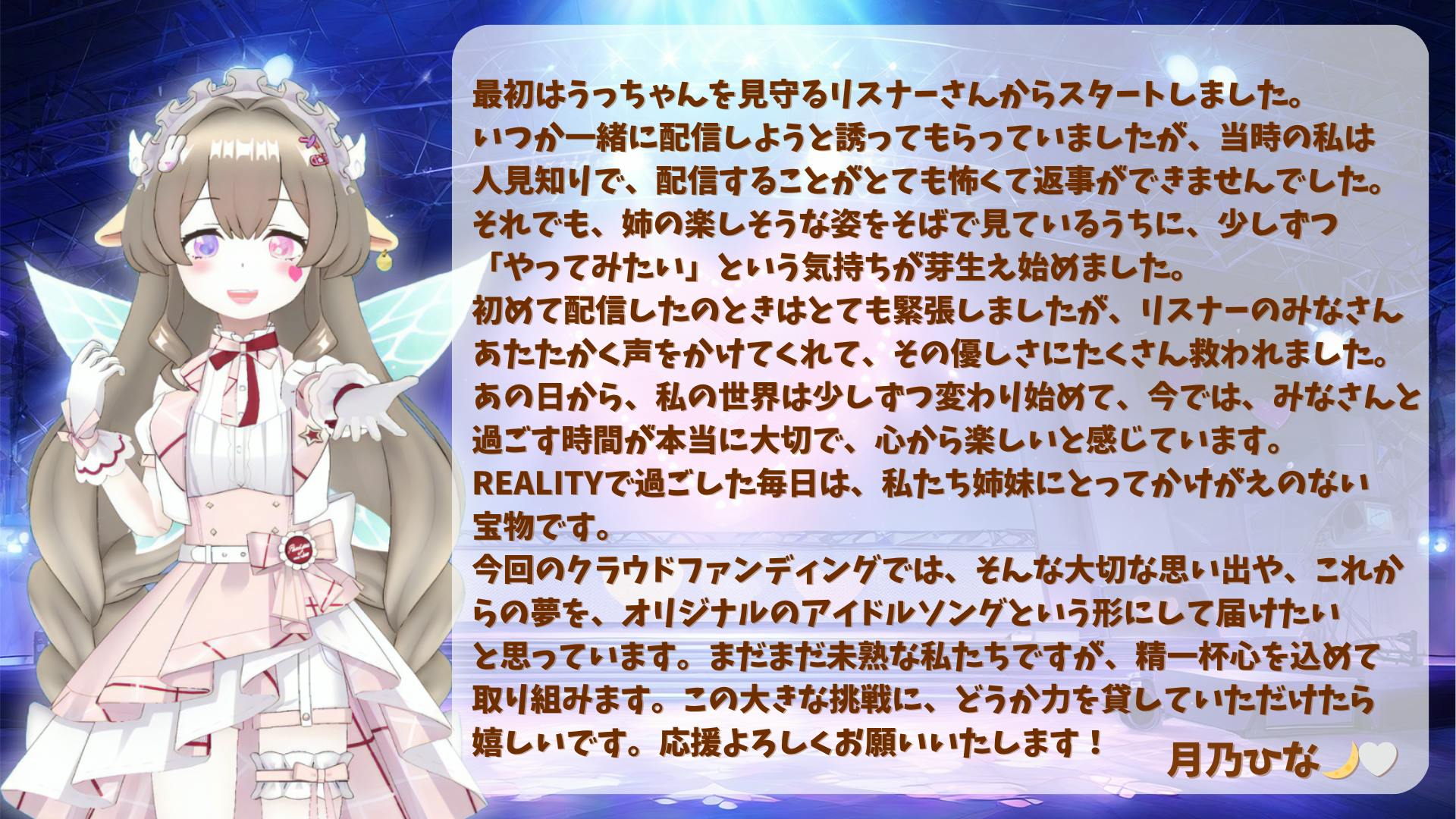 私たち姉妹は、幼い頃からアイドルが大好きで、歌うことが大好きでした。でも、自分たちの歌に自信がありませんでした。配信活動を続けていくうちに、みんなが私たちの歌を聴いてくれて、温かい言葉もたくさんいただき、もっと歌が上手くなりたいという気持ちが大きくなり、ボイストレーニングにも通い、一生懸命向き合ってきました。配信活動を続けていく中で、REALITYで出会えたみんなとの想い出をカタチにしたいと思うようになりました。それが私たちのオリジナルソングを作りたいと思ったきっかけです。