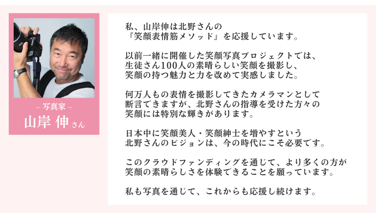 2026/01/21 15:02ご支援者の皆さまへこのたびは本プロジェクト「日本中笑顔宣言!魅力的な笑顔をつくる顔トレの力で『なりたい私』を応援したい!」に多大なるご支援・応援をいただき、誠にありがとうございました。本日をもちまして、すべての支援者の皆さまへのリターン提供が完了いたしましたことをご報告いたします。・講座・セミナー・個別レッスン・イベント参加権・その他各種リターンいずれも、無事に実施、提供を終えております。本プロジェクトは、皆さま一人ひとりの温かいご支援のおかげで、目標金額を大きく上回る形で達成し、最後まで実行することができました。心より感謝申し上げます。今回のクラウドファンディングを通していただいたご縁と応援を力に、今後も「笑顔の力」を広げる活動を続けてまいります。改めまして、このたびは本当にありがとうございました。今後ともどうぞよろしくお願いいたします。 もっと見る