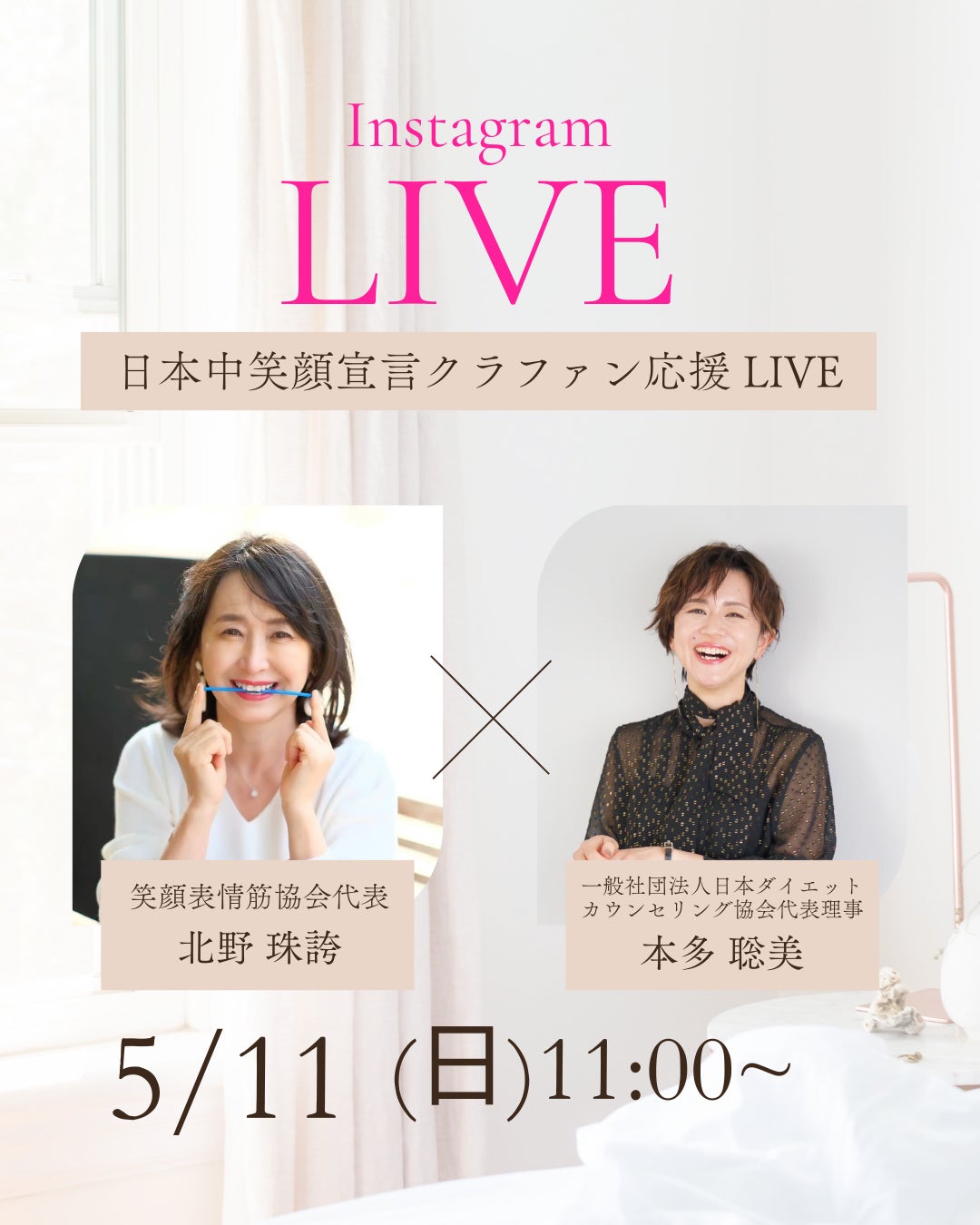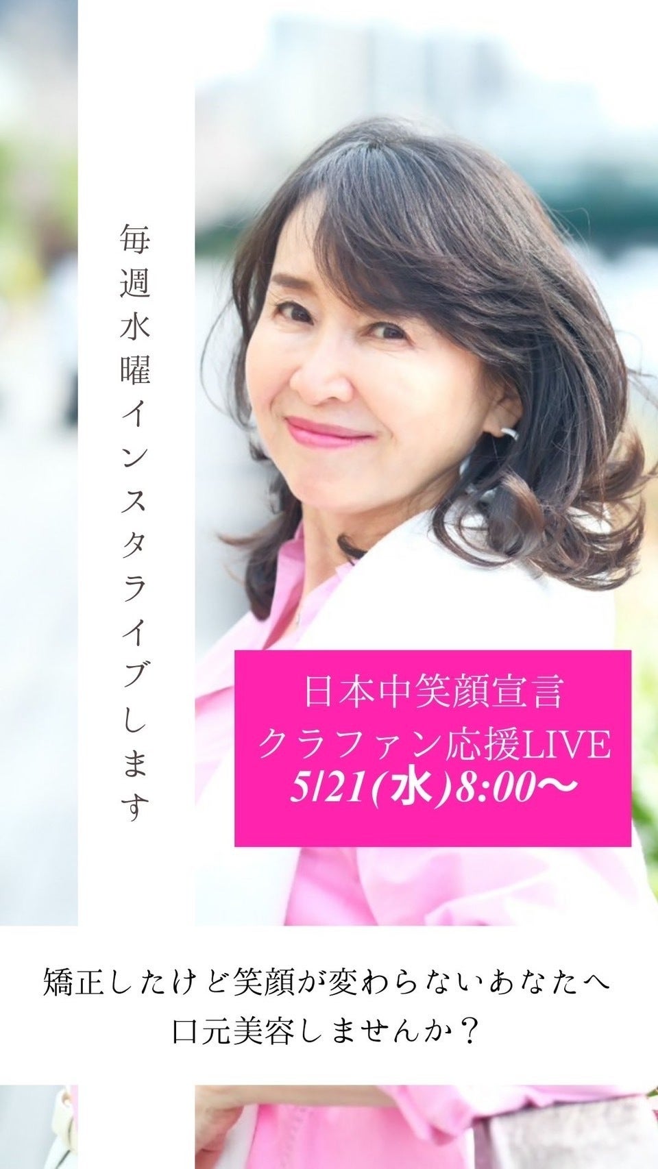 こんにちは!笑顔表情筋協会 代表 北野みほです。現在進行中のクラウドファンディング、たくさんの応援・ご支援、本当にありがとうございます。「整形なしで、理想の笑顔をつくる」このメソッドを日本中に届けたいという想いから始めた今回のクラファン。少しずつではありますが、皆さんのおかげで確実に広がりを感じています! 【実績のご紹介】私たちの笑顔表情筋メソッドは、日常で活かせるだけでなく、ステージで輝くプロフェッショナルの表情づくりにも活用されています。たとえば2022年には、ミスジャパン日本大会の公式講師として、全国から集まったファイナリストたちに「表情美トレーニング」を指導しました。「第一印象は3秒で決まる」と言われる中、単に“笑っている”だけではなく、“自分の魅力を最大限に引き出す笑顔”の作り方をお伝えし、多くの出場者から「自信が持てた」「笑顔に説得力が出た」といった声をいただきました。皆さん本当にお綺麗で悩みなんかないのかなと思っていたのですが実は・・・とたくさんの方から個別に相談が殺到しました!こんなにもキレイな方も笑顔に悩んでいることを知りました。これまで経験から、笑顔は誰かに選ばれるための大切な武器になることを確信しました。【インスタライブ開催中!】毎週水曜8:00から・小顔になる秘訣・シワたるみ改善法・パッチリお目目になるトレーニングなどクラファンにあわせて、Instagramライブも連続開催中「たるみ」「ほうれい線」が気になる方必見の内容です!またさらに、どんな質問にも答えますのでお悩みがある方はぜひお気軽に遊びに来てくださいね♪次回の配信:5月21日(水)8:00〜インスタアカウント https://www.instagram.com/mihoko.kitano_egao?igsh=MW1vdzJjZHVhNjlwcg%3D%3D&utm_source=qr「整形なしでここまで変わるんだ!」と驚かれること間違いなし。ぜひリアルタイムでご参加くださいね最後に…笑顔には、人を癒し、人生を変える力があります。このプロジェクトを通して、もっと多くの人に「笑顔ってすごい!」と感じてもらえたら嬉しいです。引き続き、あたたかい応援・シェアをよろしくお願いいたします!それではまた、笑顔でお会いしましょう〜〜!感謝を込めて笑顔表情筋協会 代表 北野より