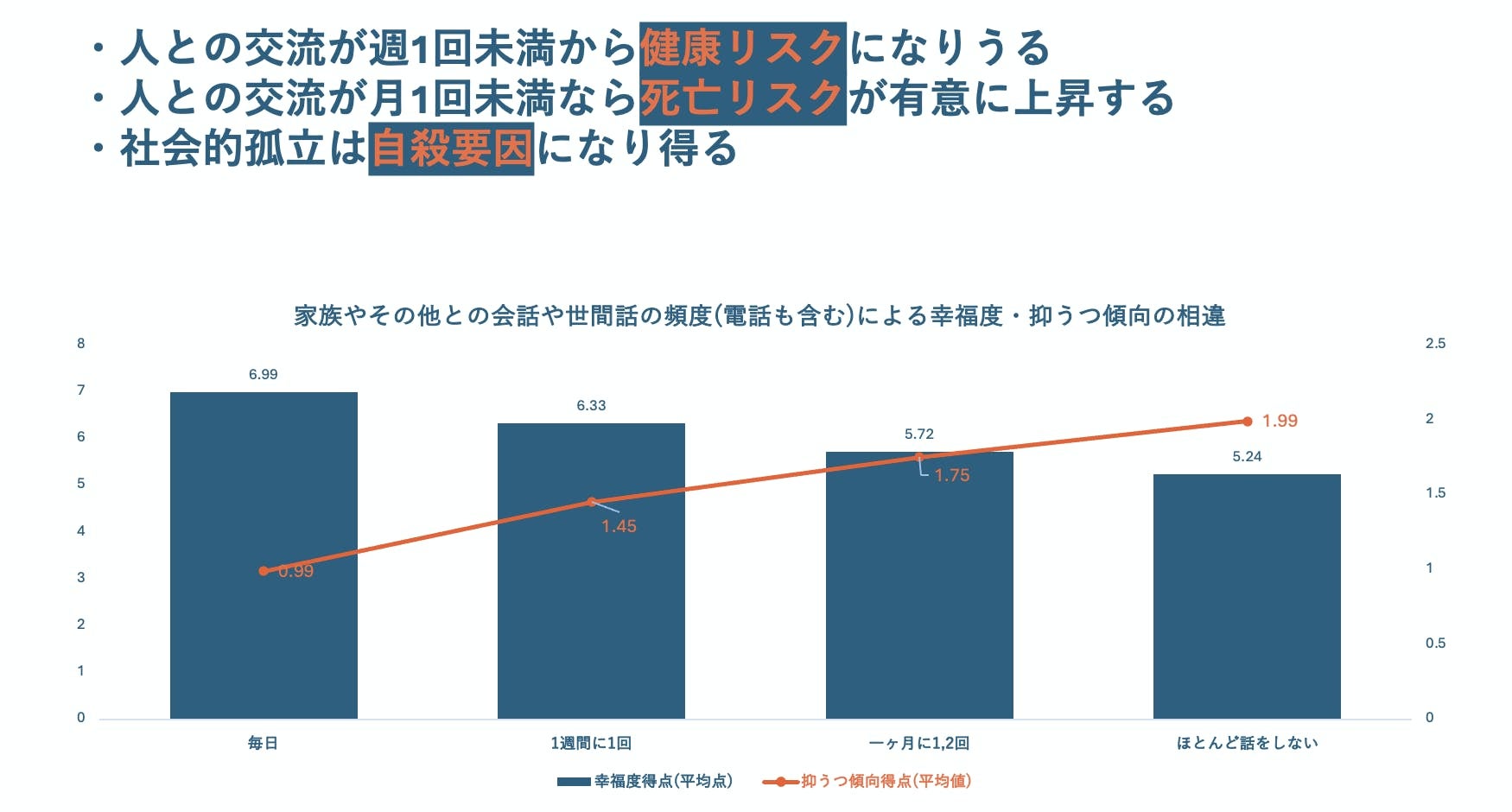 こうした孤立は、生きがいの喪失だけでなく、健康リスクや自殺リスクを高めます。