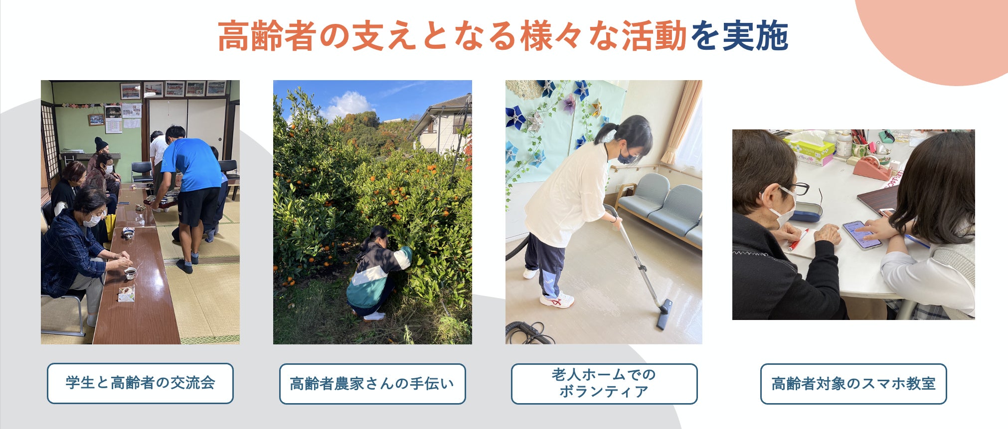 約6年間、離島・高齢化率47%という地域特性の中で、農業ボランティアやスマホ教室、老人ホームでの交流活動など、高齢者の方々と日常的に関わる機会を多く持ってきました。介護スキルも専門知識もない私たちですが、"話す・寄り添う・ちょっと手伝う"だけでも、確かに高齢者の方々の力になれる。活動を通して集積したそんな実感が、今回のプロジェクトにつながっています。