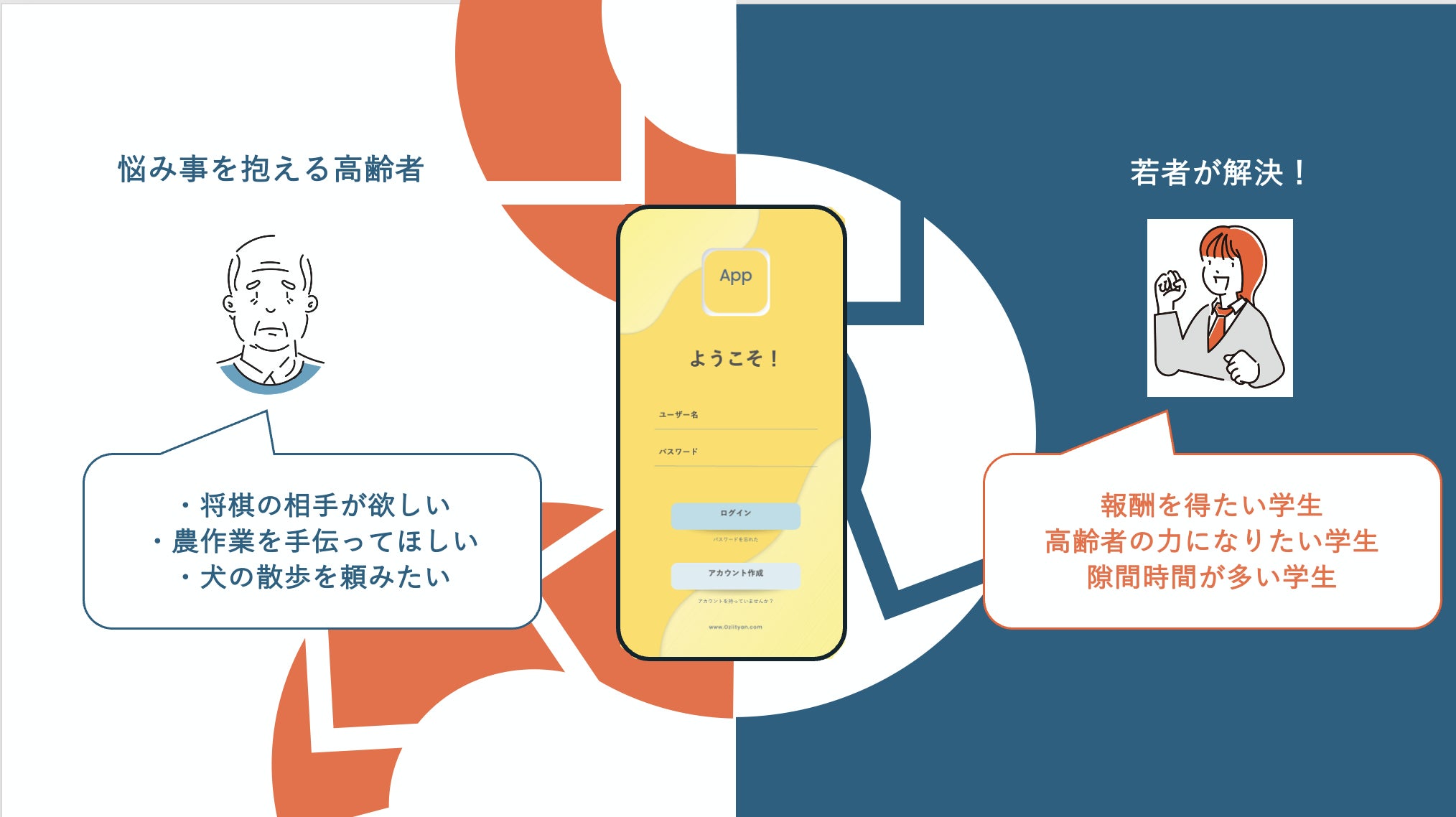 地域の中にひとりはいるような、ちょっと頼りがいのあるおじいちゃんのような存在。高齢者にも若者にも馴染みやすく、“人と人をつなぐ存在”として記憶に残るような名前を目指しました。