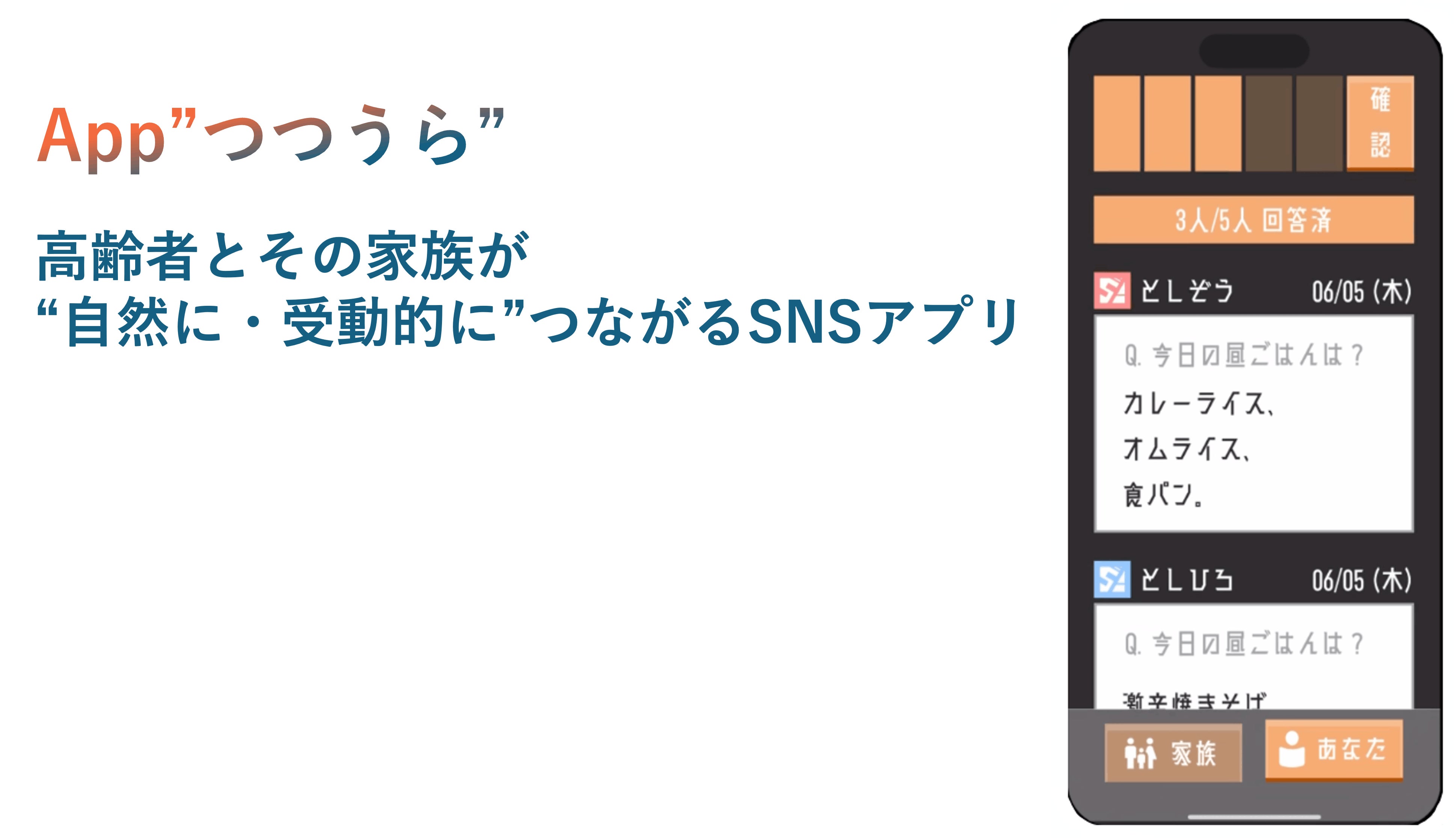 このアプリは、高齢者とその家族が“自然に・受動的に”つながるSNSアプリです。