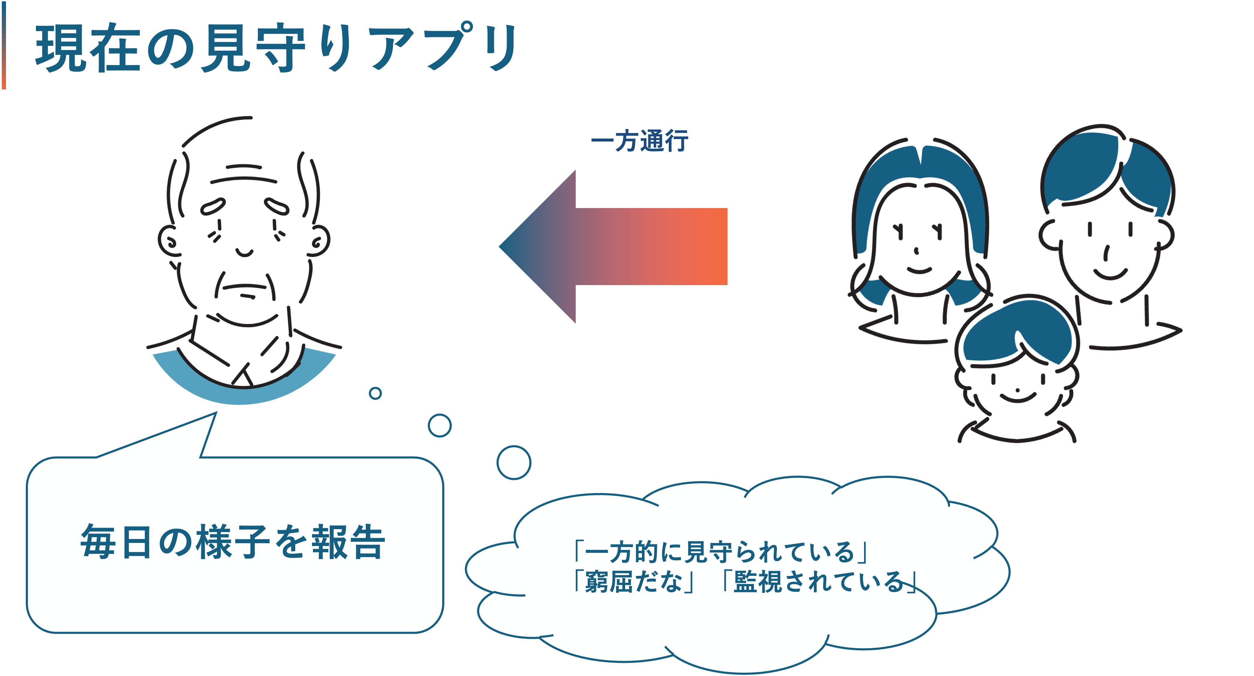 現在の高齢者見守りアプリは、高齢者の方々に毎日今日の様子を答えてもらい、その結果が家族側に送られるといった仕様になっていますがこれは、「一方的に見守られている」という感覚が、高齢者にとって監視されているように感じられる可能性があります。