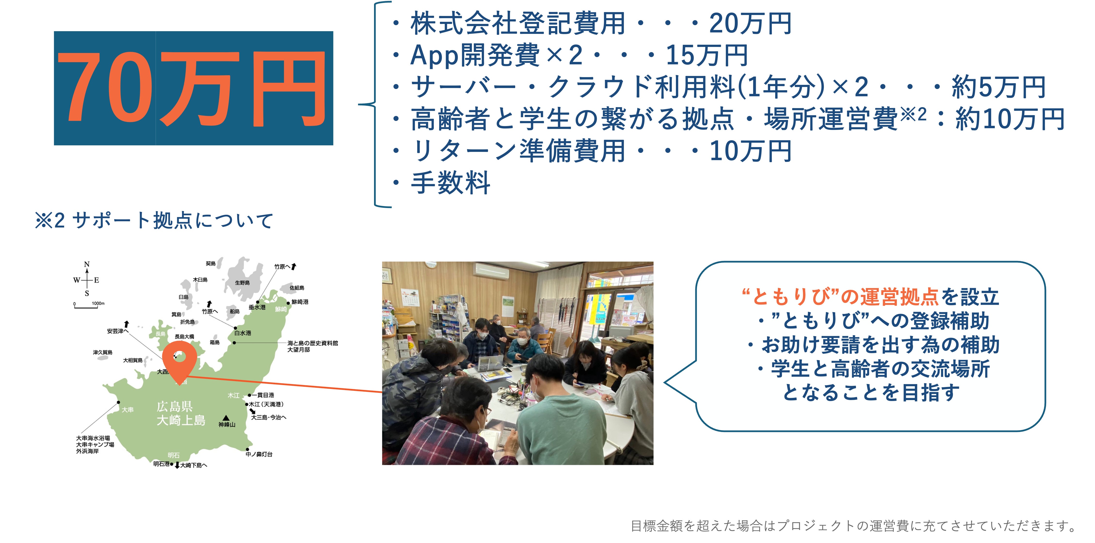 アプリを継続的に提供するための基盤維持費用です。・“ともりび”の運営拠点設置・場所運営費:約10万円