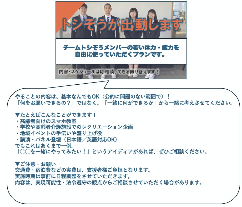 支援に応じた学生には、高齢者の方から時給1,000円分+交通費が支払われる仕組みとなっており、若者にとっても“人の役に立つ喜び”と“実益”が両立できる設計です。