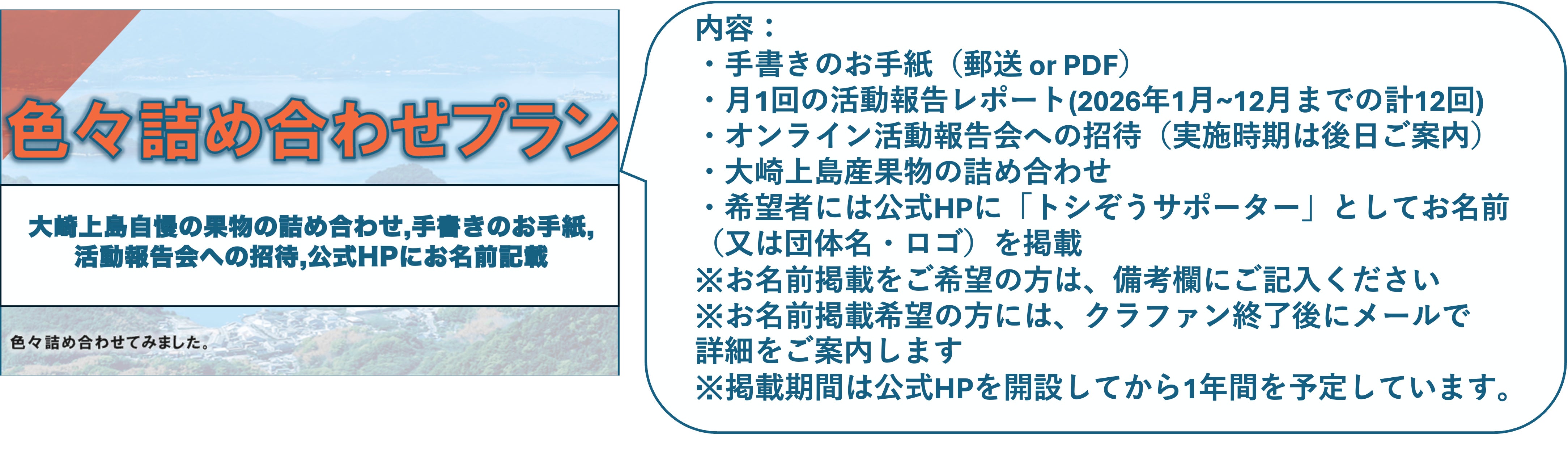 私たちだからこそできる手作りのお礼や、活動拠点である広島県・大崎上島の農家さんのご協力による地域の特産品など、金額にかかわらず、私たちの想いがしっかり届くような内容を一つひとつ丁寧に選んでいます。