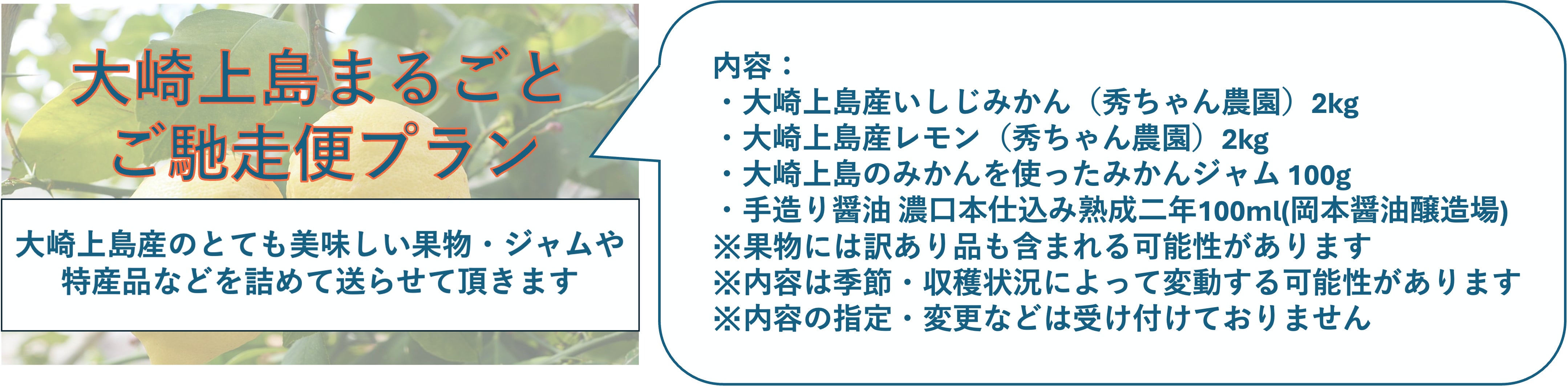 私たちの活動拠点である広島県大崎上島。その土地で育ったおいしい恵みを、支援の感謝とともに詰め合わせてお届けします。