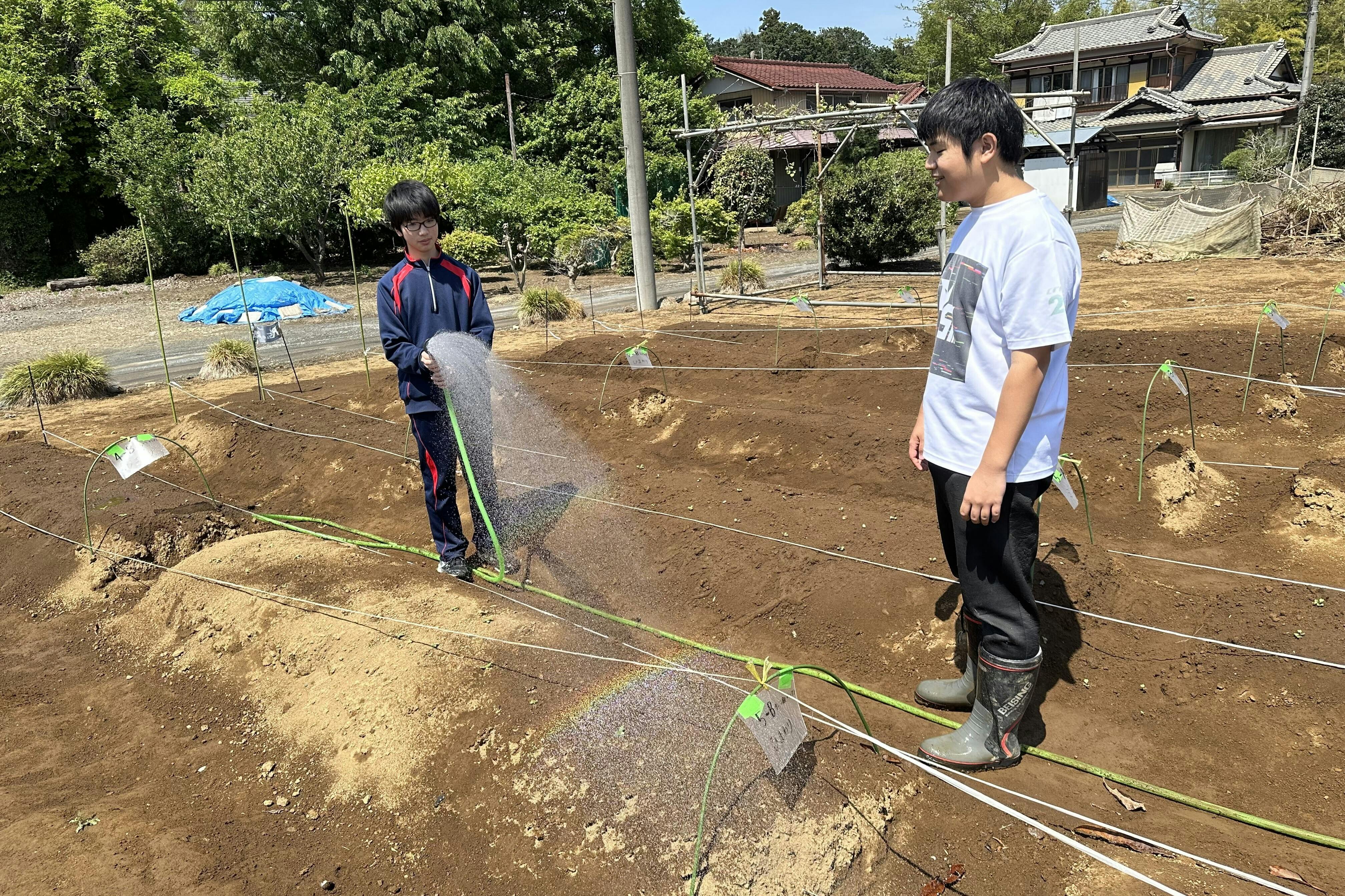 次にこちらは新たな検証実験のため3月末に耕し、4月に種まきをした畑に水やりをしているところです。うっすらですがきれいな虹ができました。